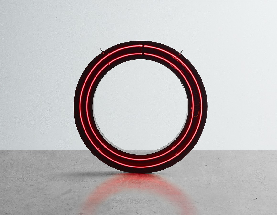 Exposed double clear red neon circles mounted within a black aluminium circle tray