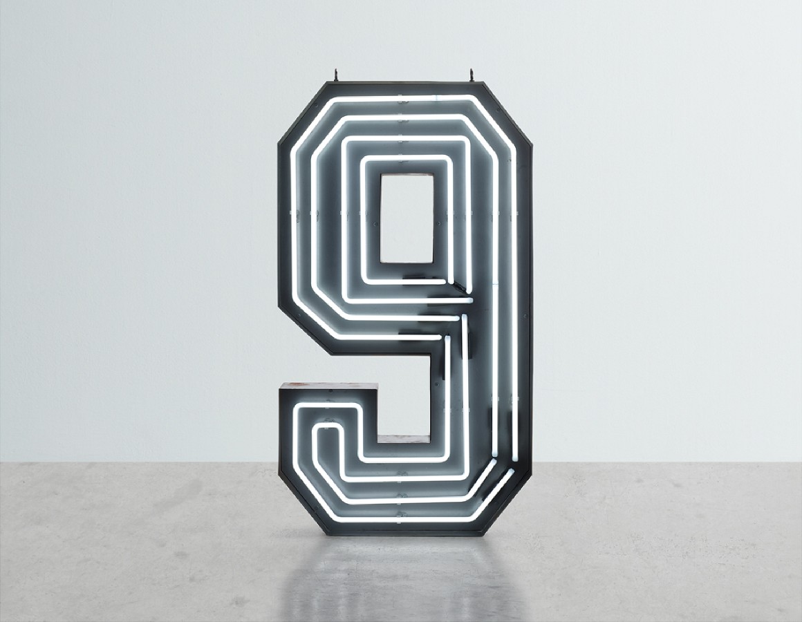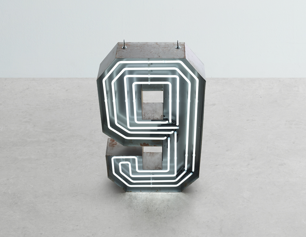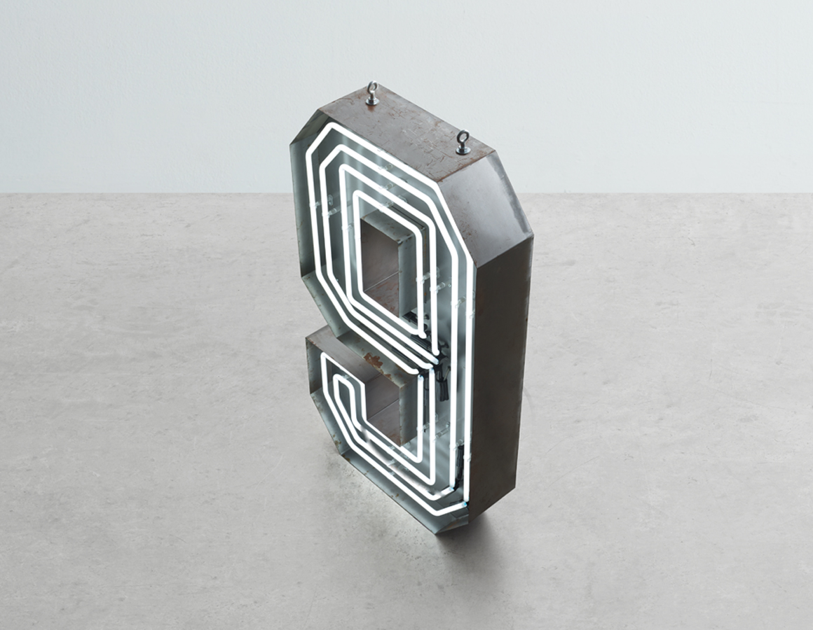 number ‘9’ multi line white neon mounted within an aged steel open front trough
