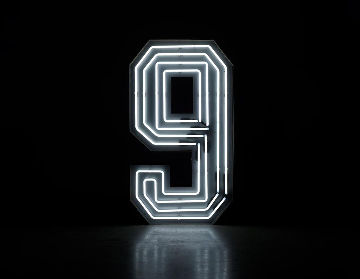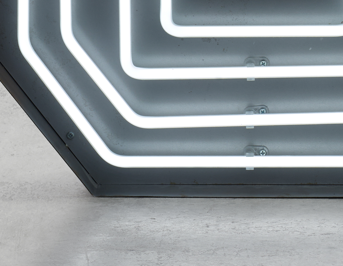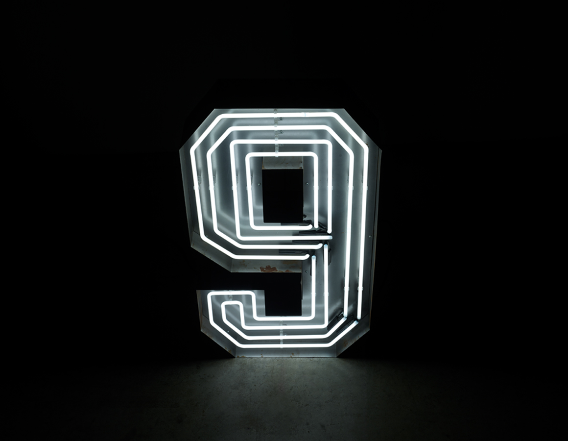 number ‘9’ multi line white neon mounted within an aged steel open front trough