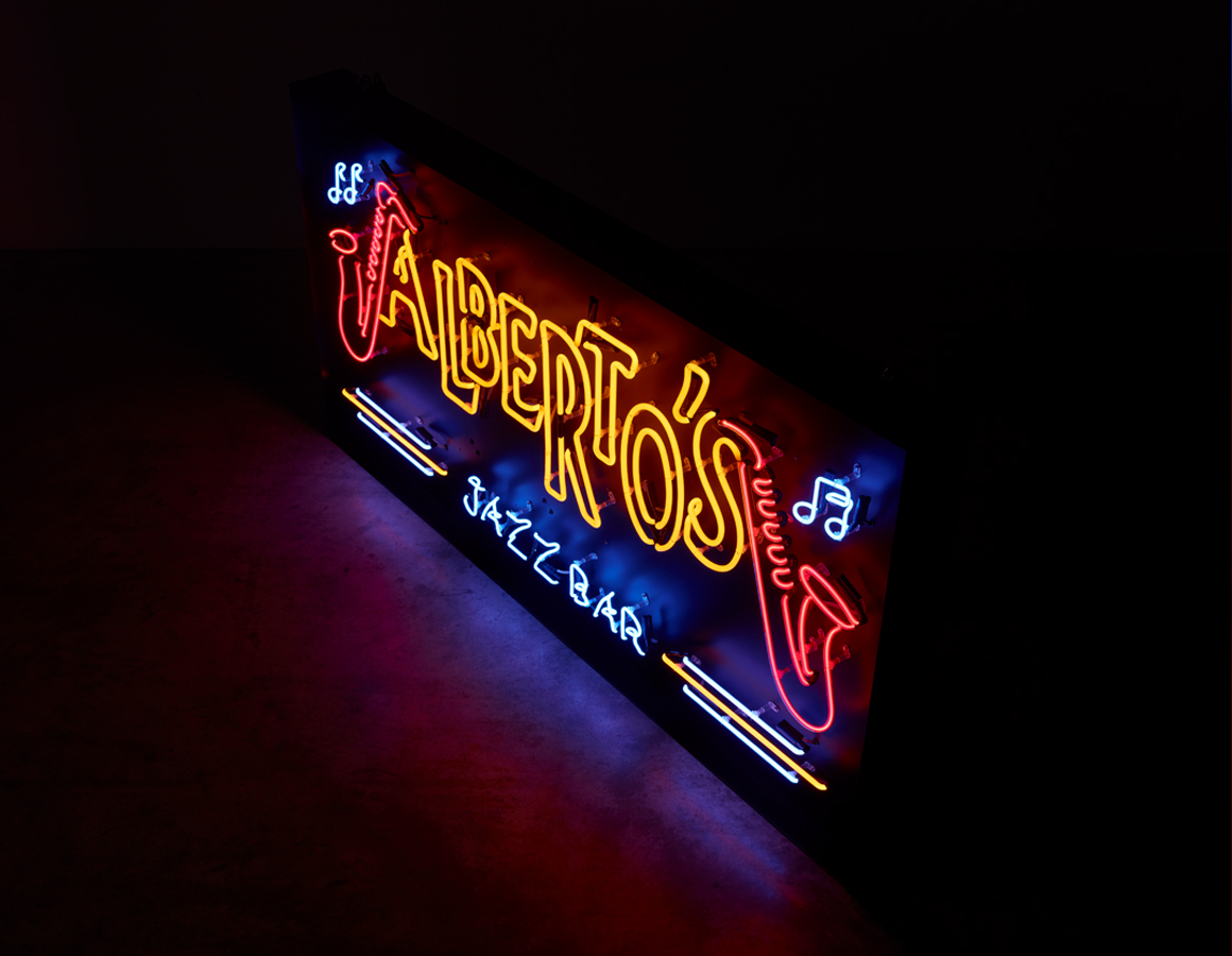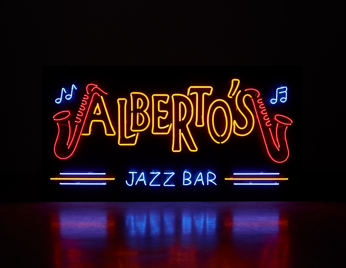 Alberto’s jazz bar neon mounted within a black aluminium tray