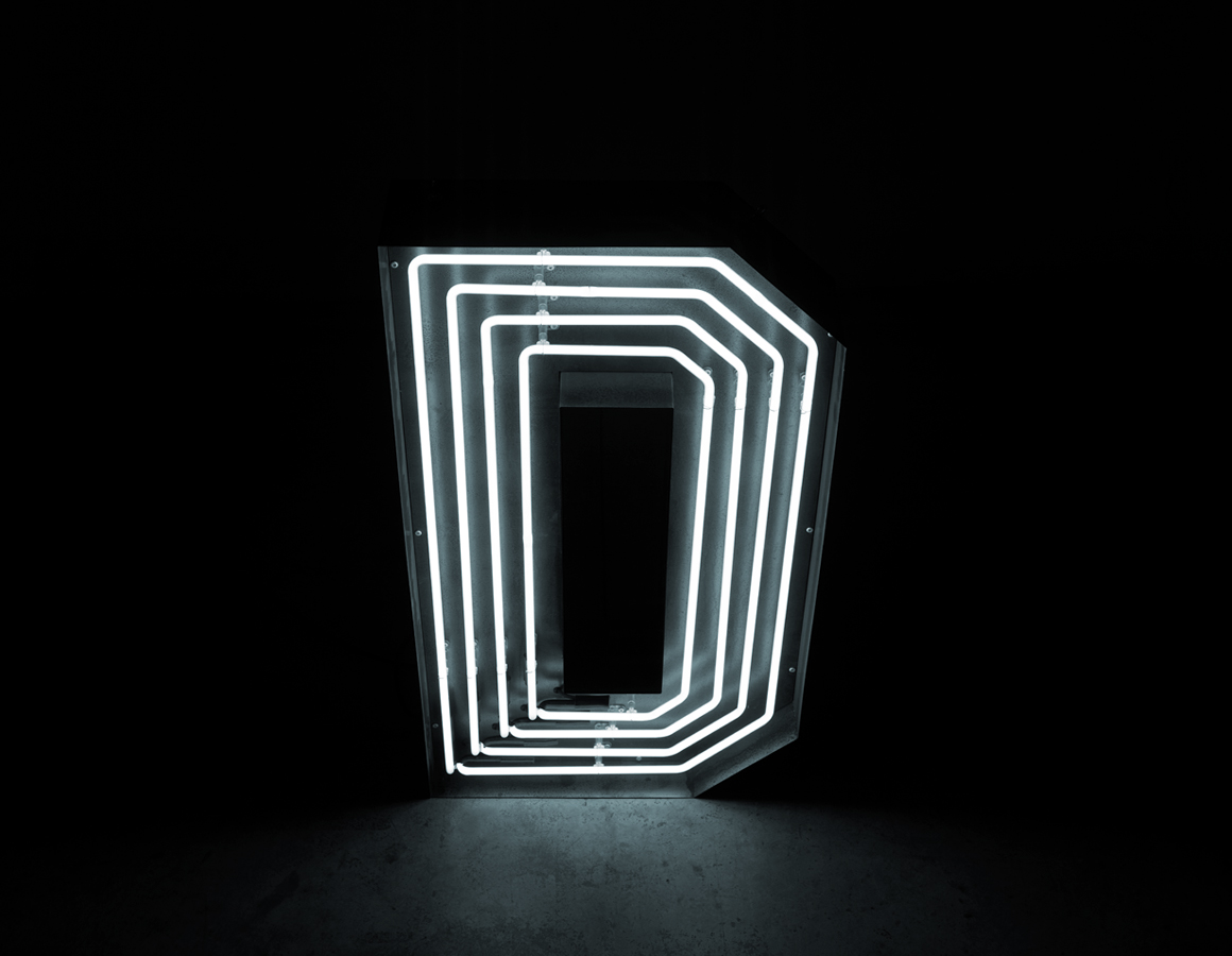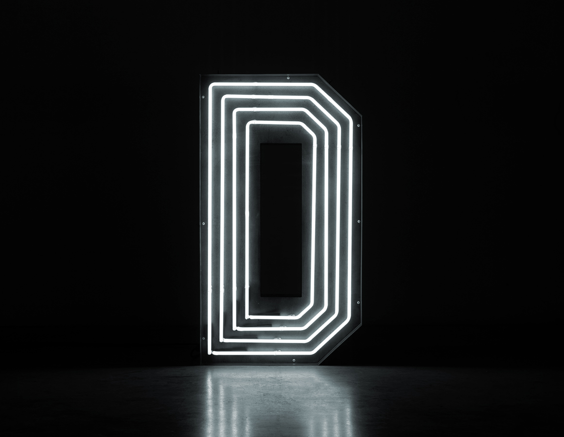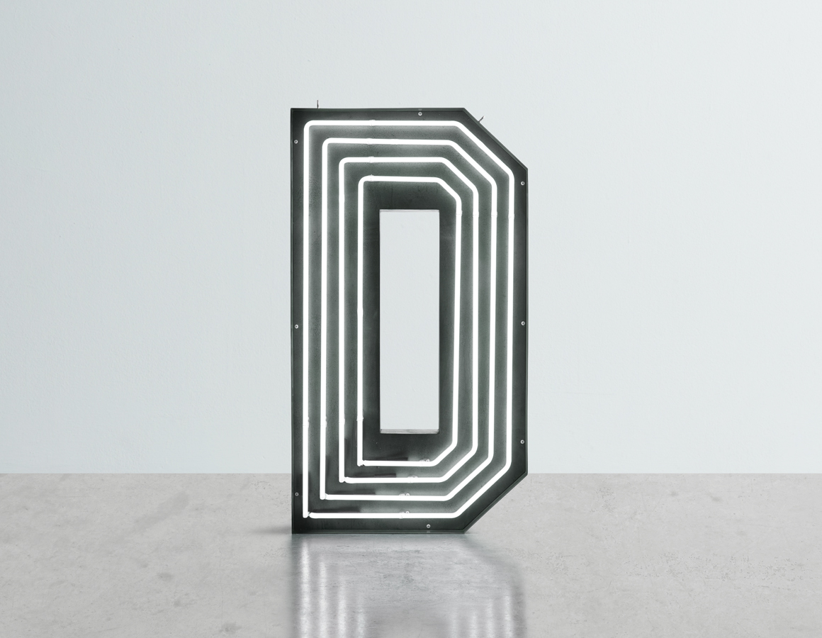 neon letter D -multi line white neon mounted within an aged steel open front trough