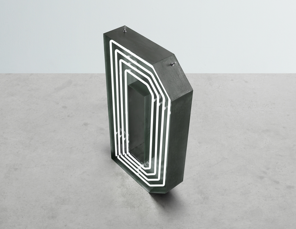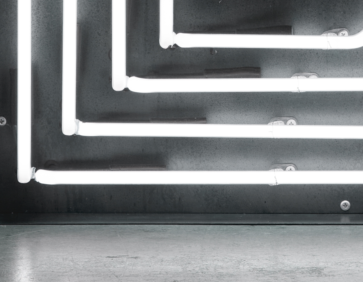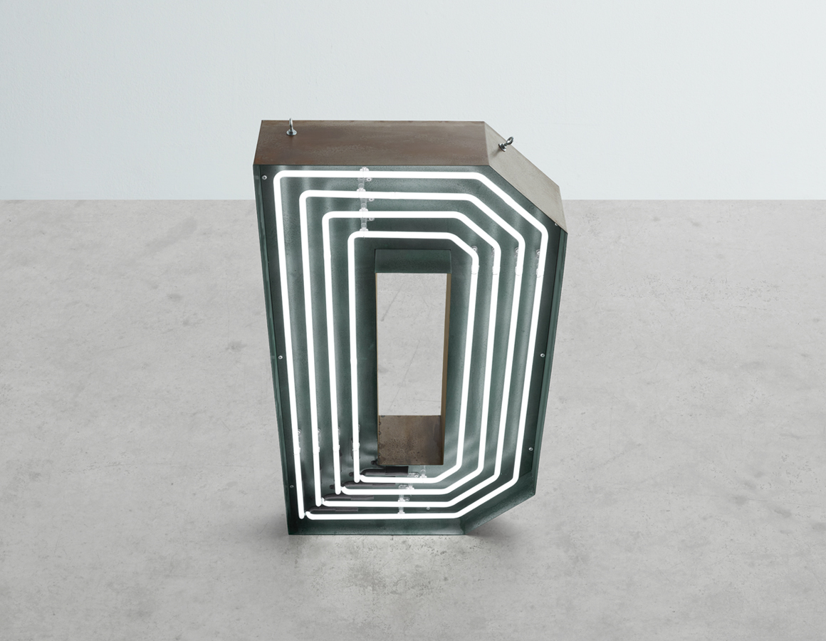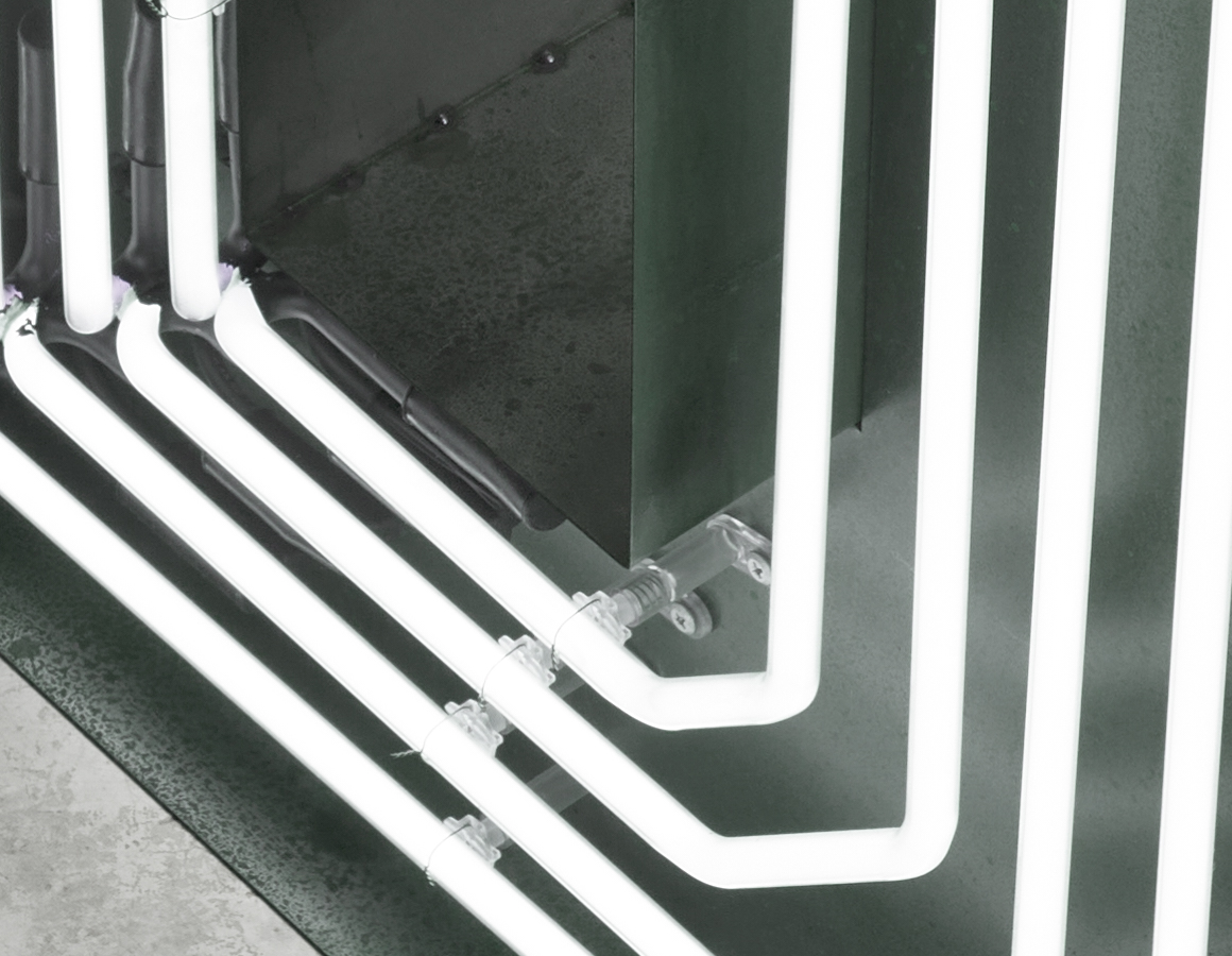 neon letter D -multi line white neon mounted within an aged steel open front trough