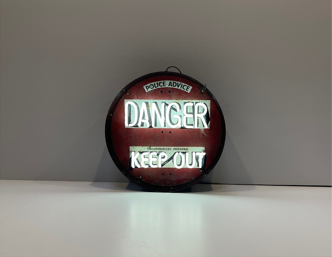 Danger keep out neon on vintage steel sign mounted within a circular backing tray