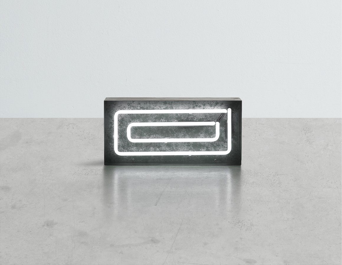 neon hyphen / dash -multi line white neon mounted within an aged steel open front trough