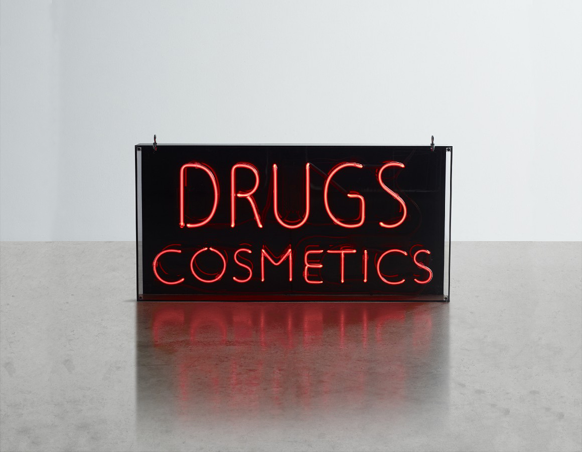 Drugs cosmetics clear red neon lettering mounted within an acrylic case