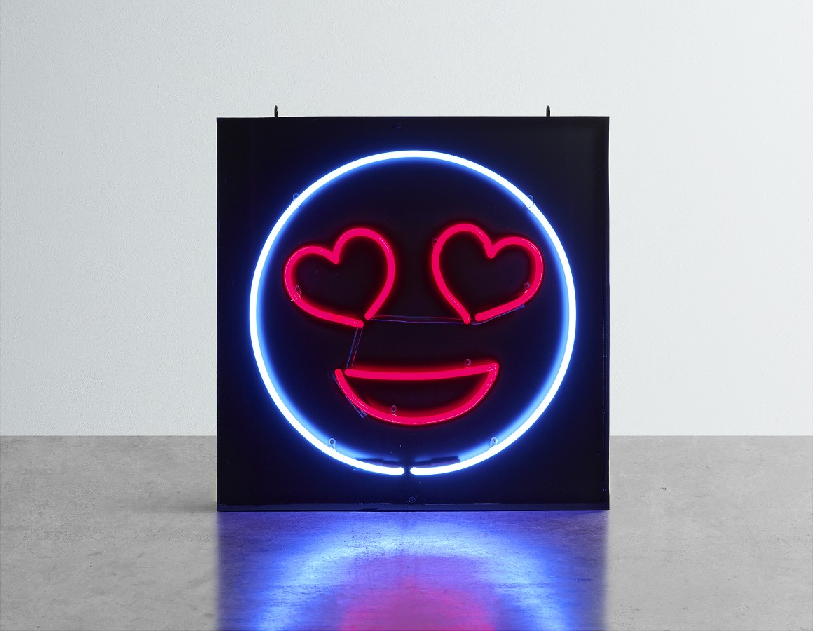 Emoji love heart eyes neon mounted within a black steel case