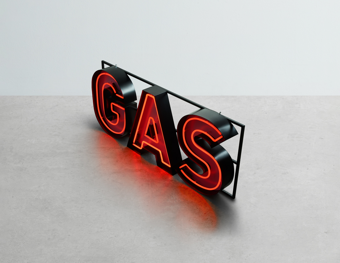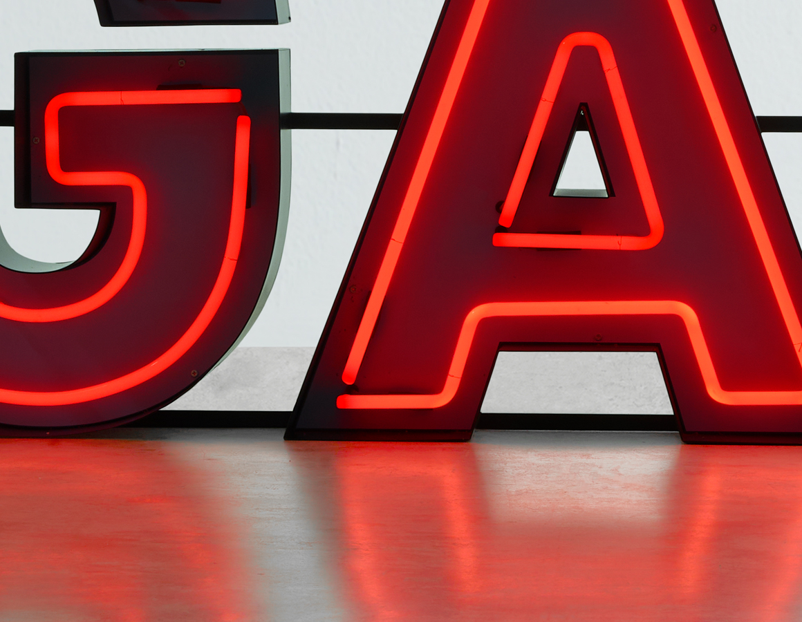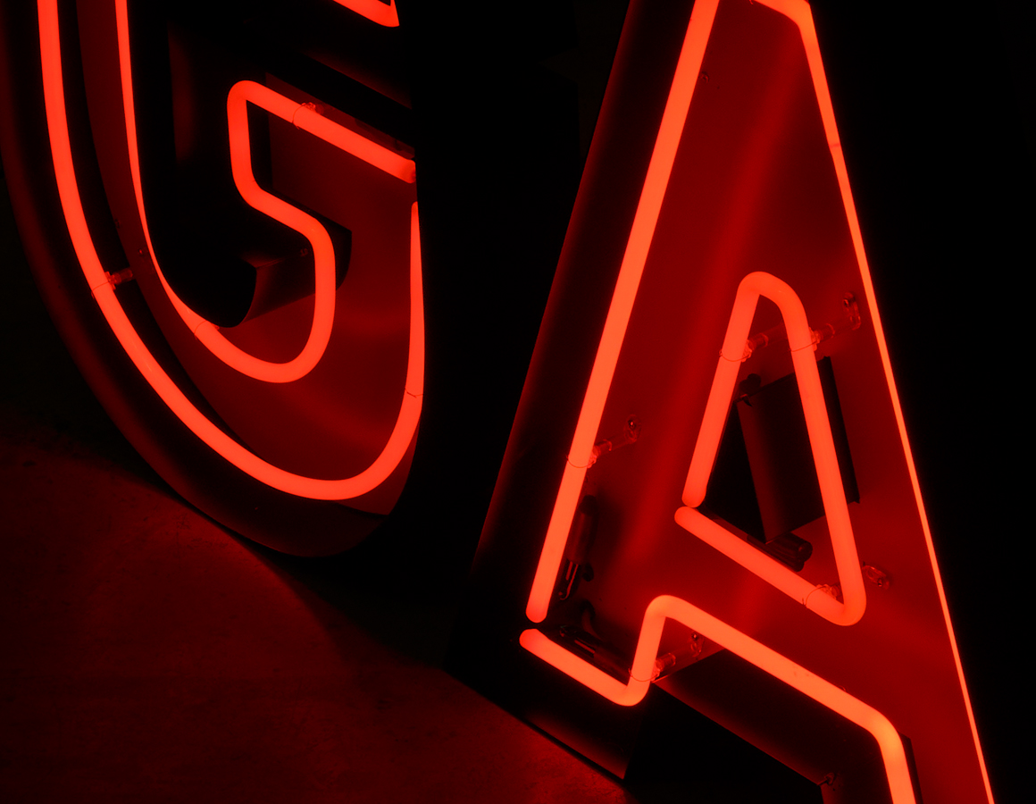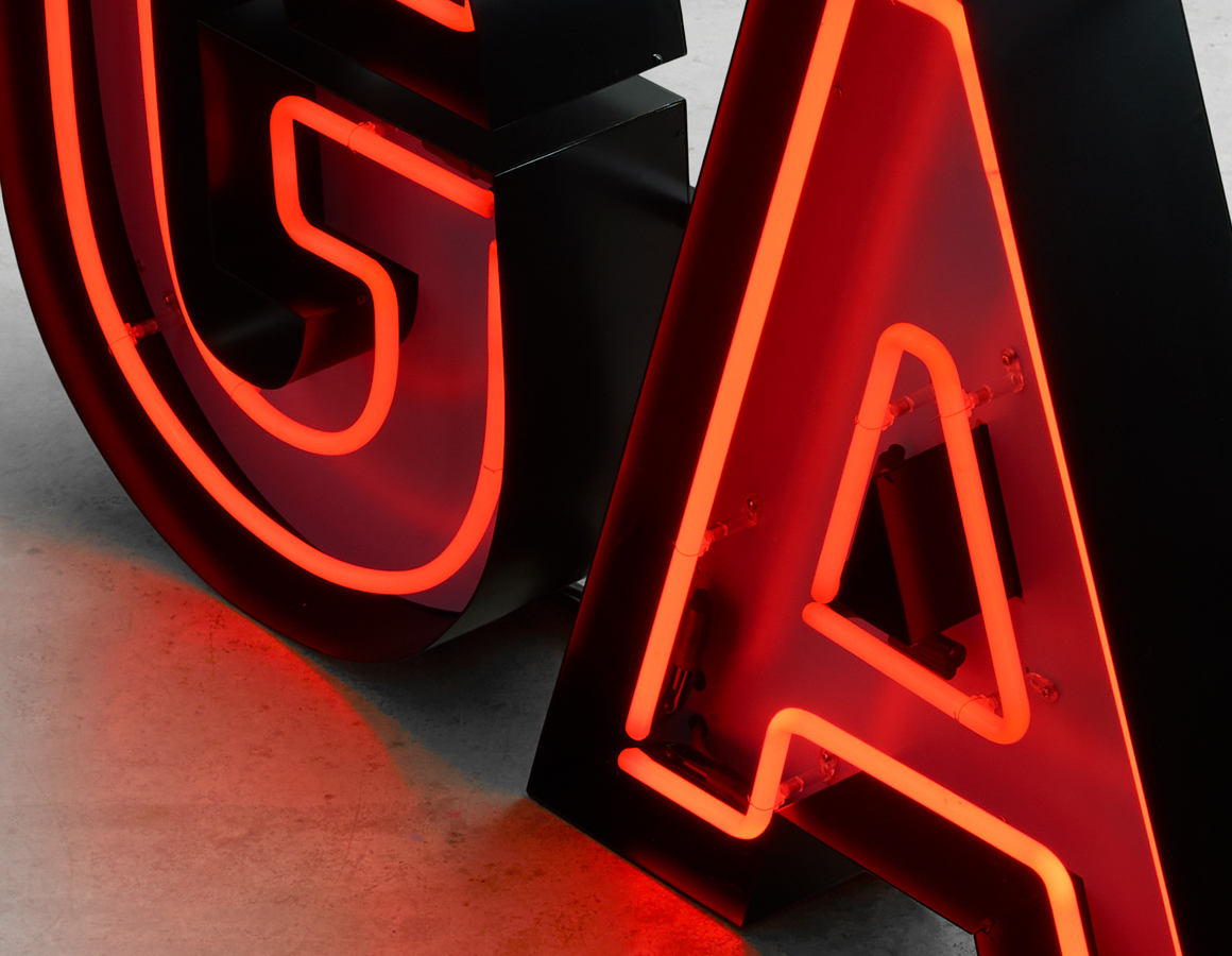 Exposed citrus orange neon letters mounted within black aluminium trough letters attached to rear frame