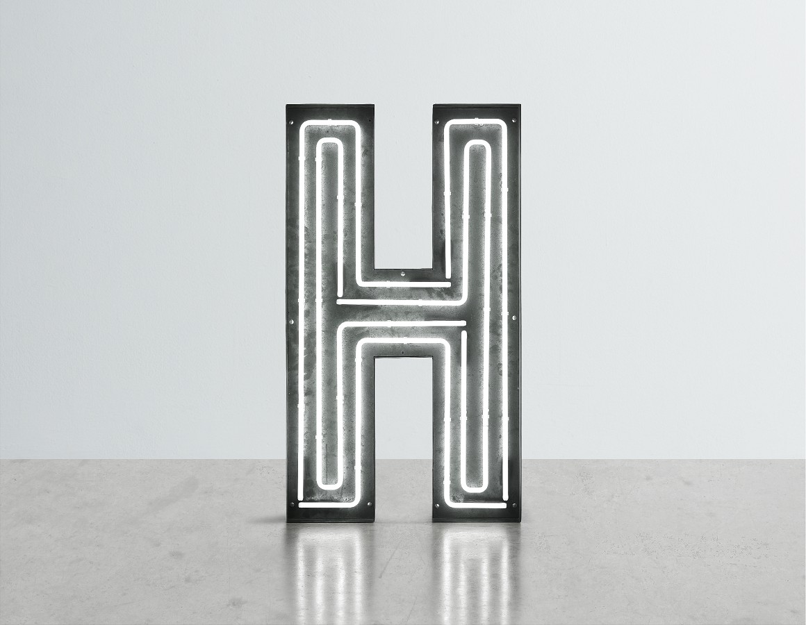 neon letter H -multi line white neon mounted within an aged steel open front trough