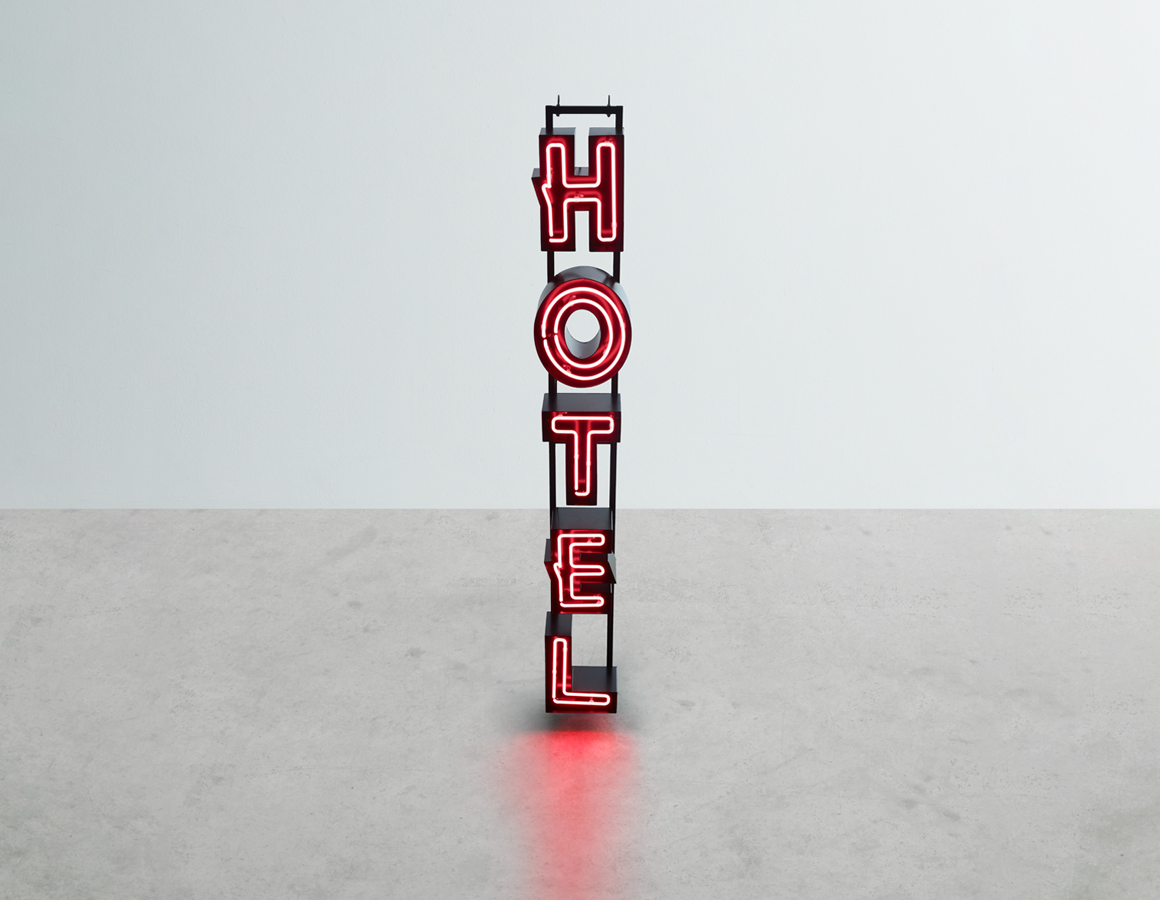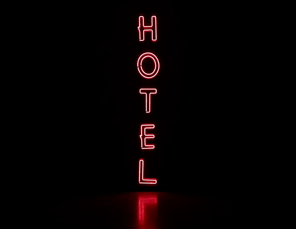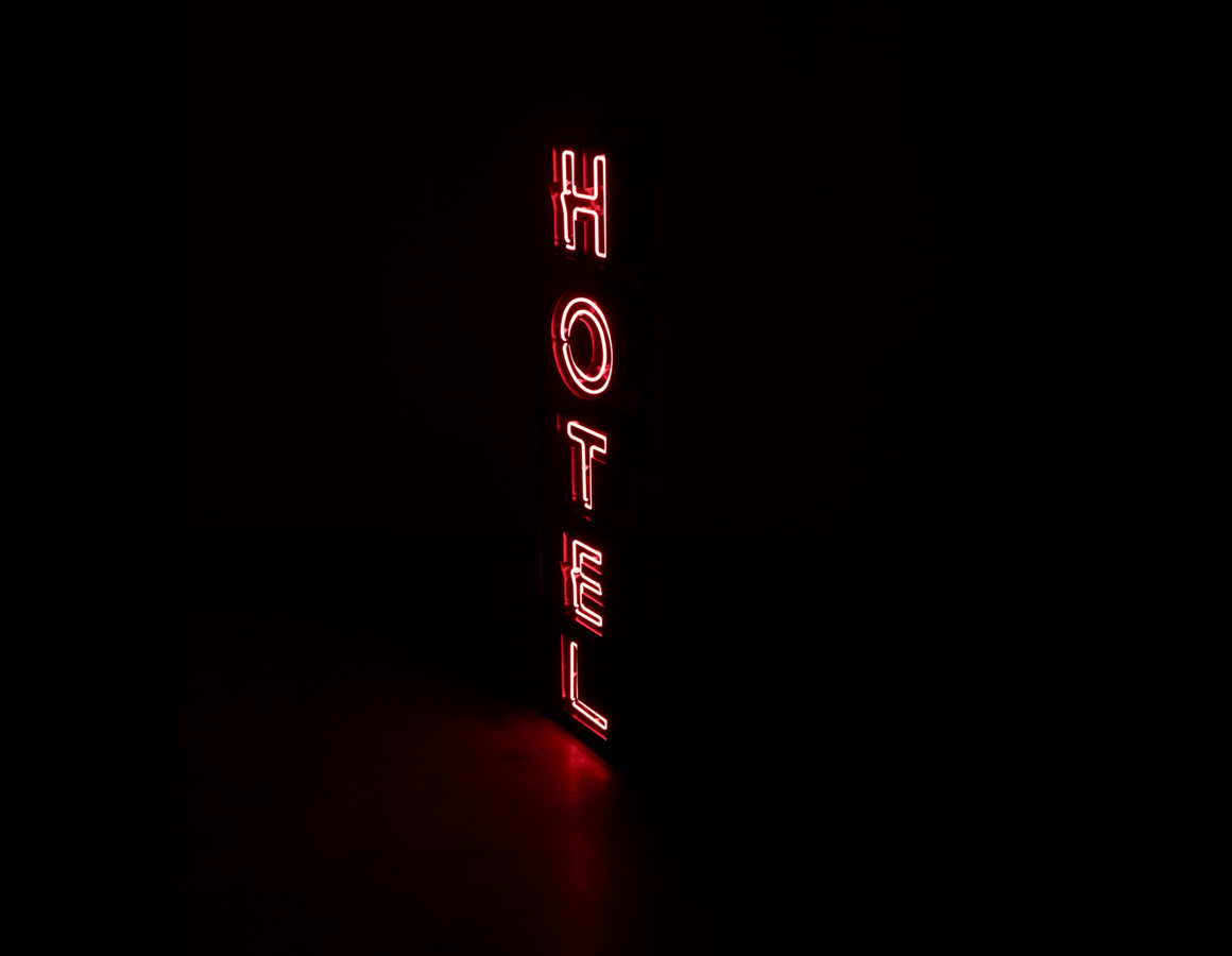 Hotel pink neon mounted within black aluminium trough letters mounted onto a rear frame-work.