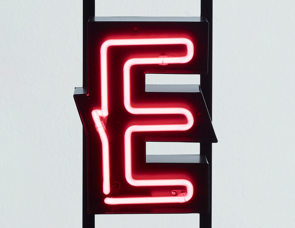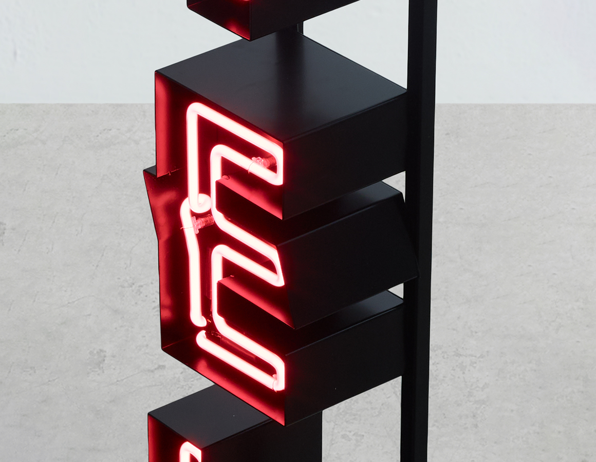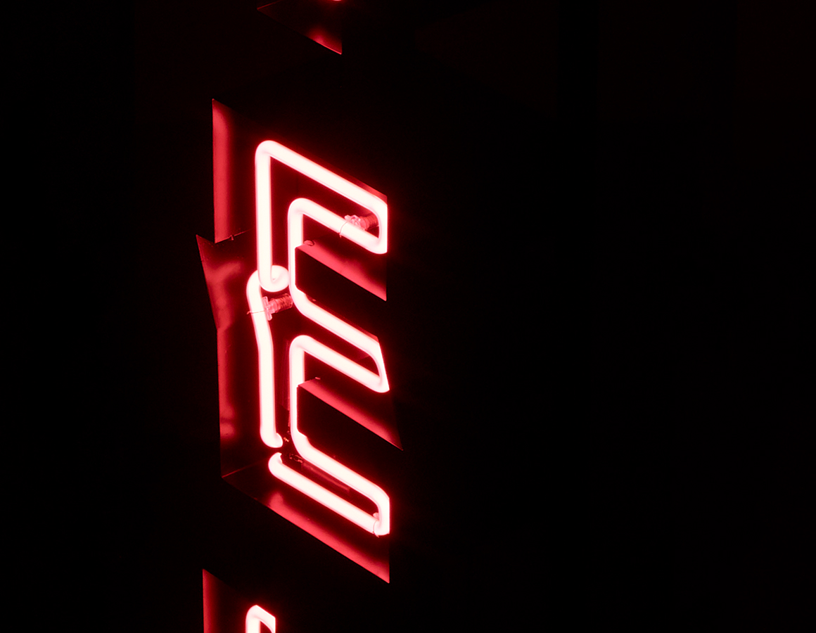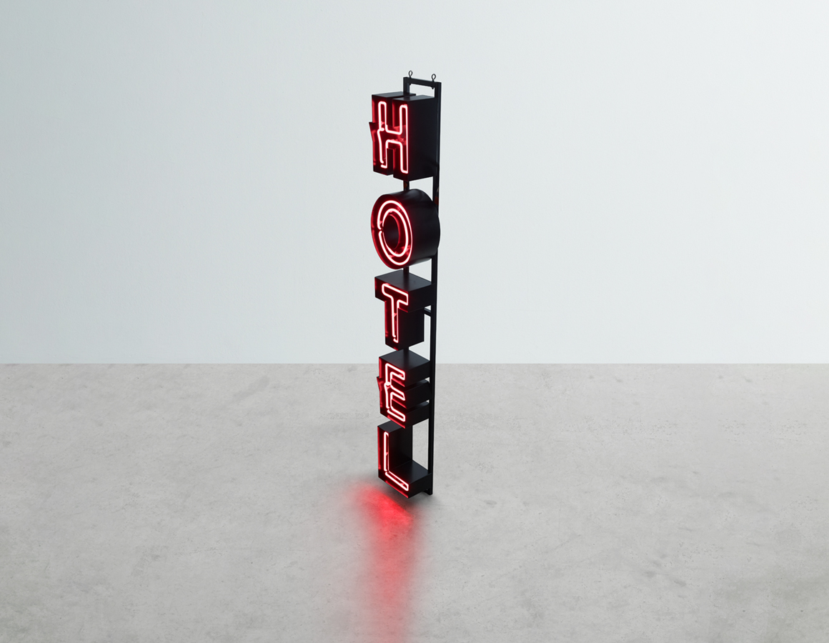 Hotel pink neon mounted within black aluminium trough letters mounted onto a rear frame-work.