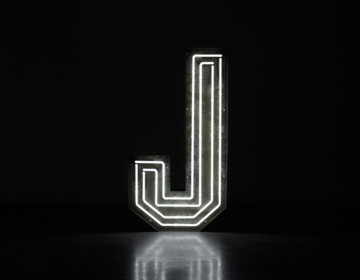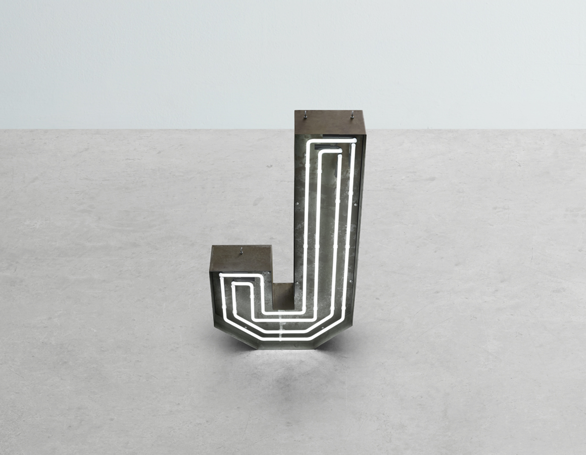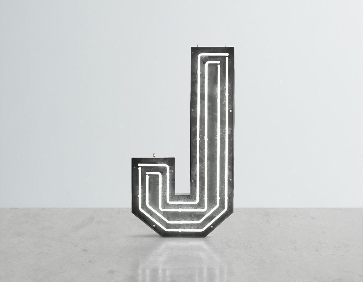 neon letter J -multi line white neon mounted within an aged steel open front trough