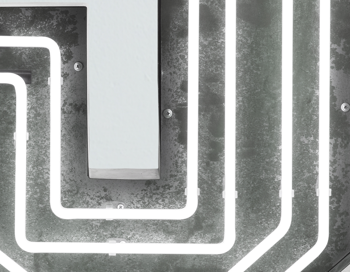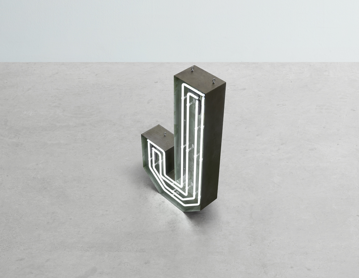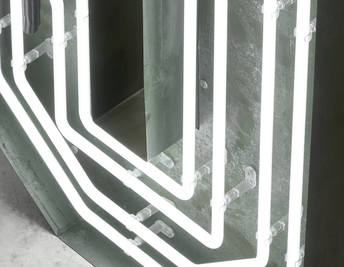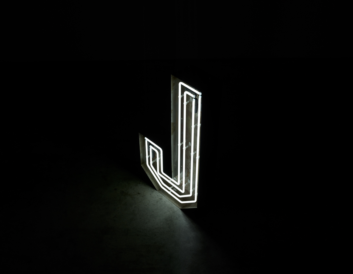 neon letter J -multi line white neon mounted within an aged steel open front trough