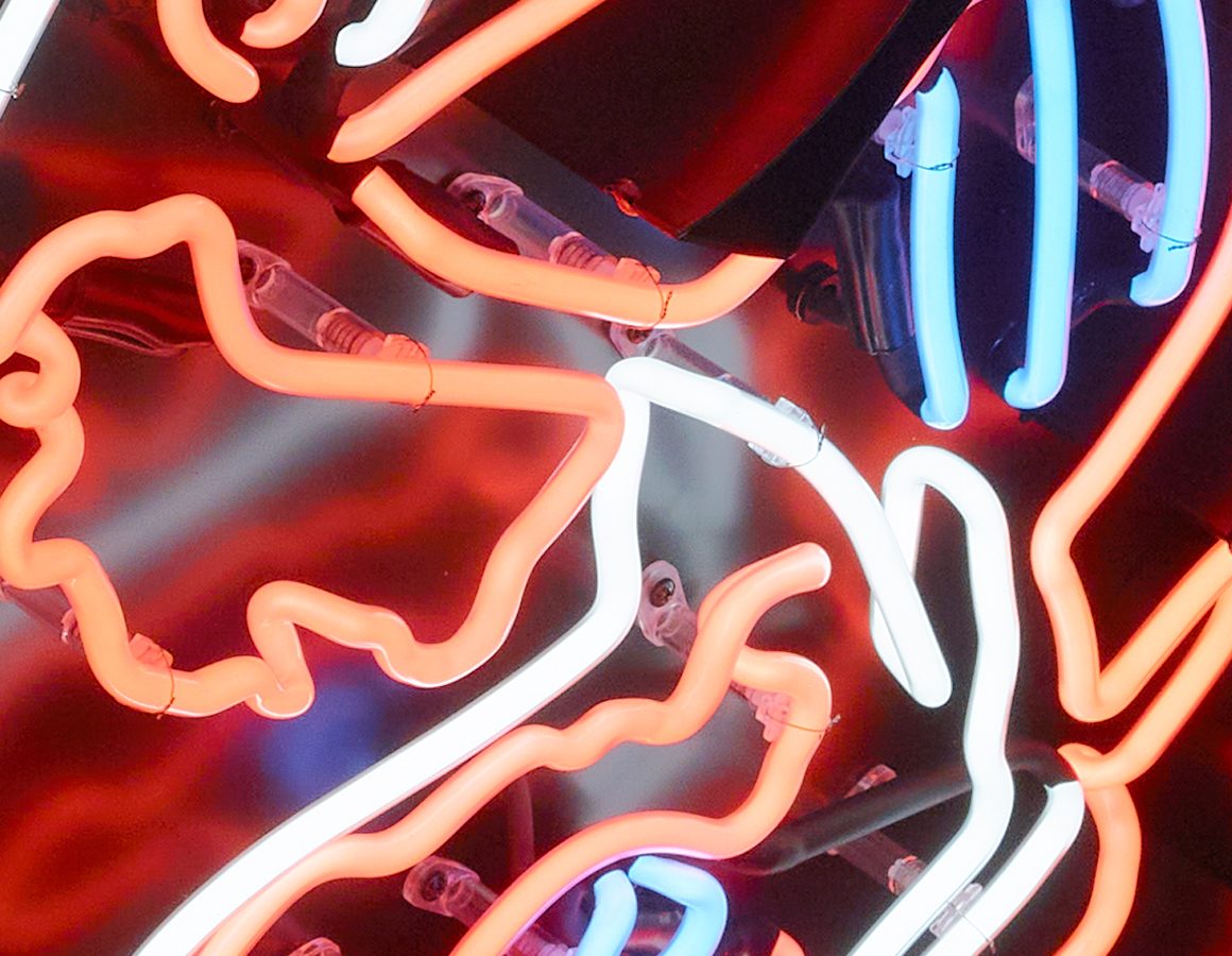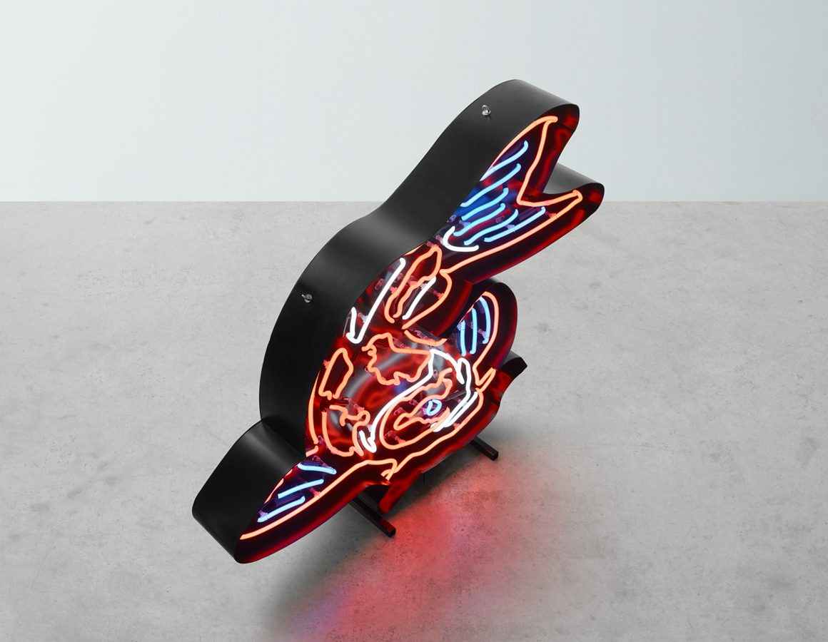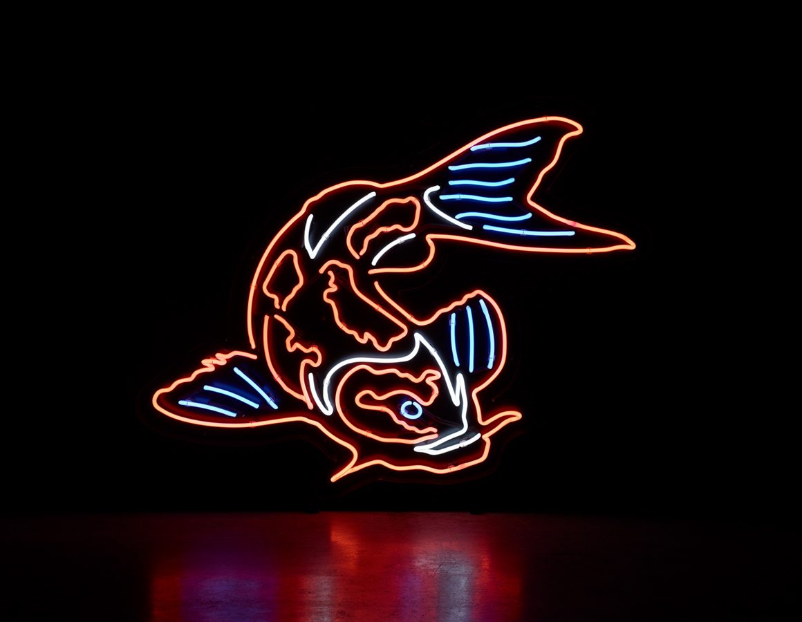 exposed neon koi mounted within a shaped backing tray with detachable stand