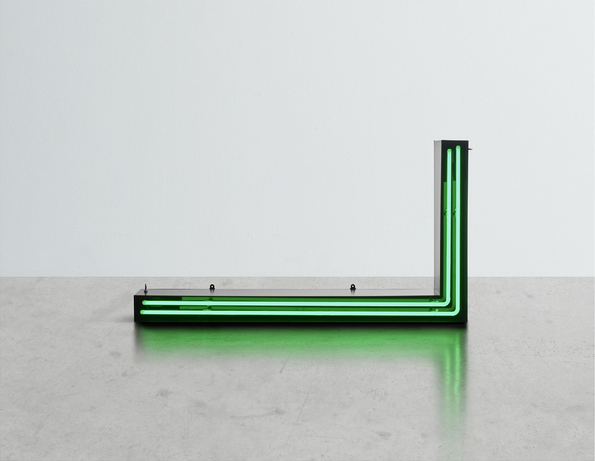 L shape border green neon mounted within a shaped backing tray