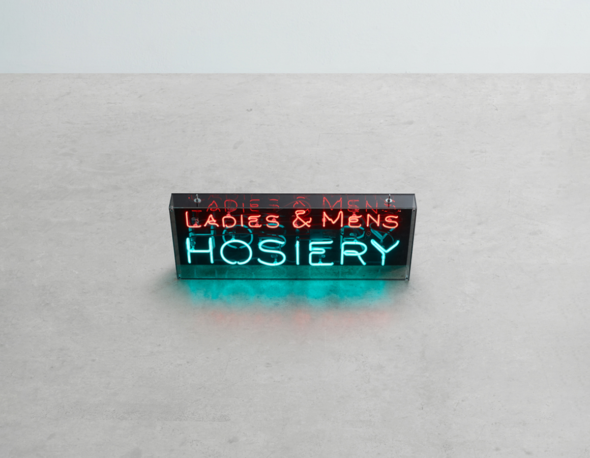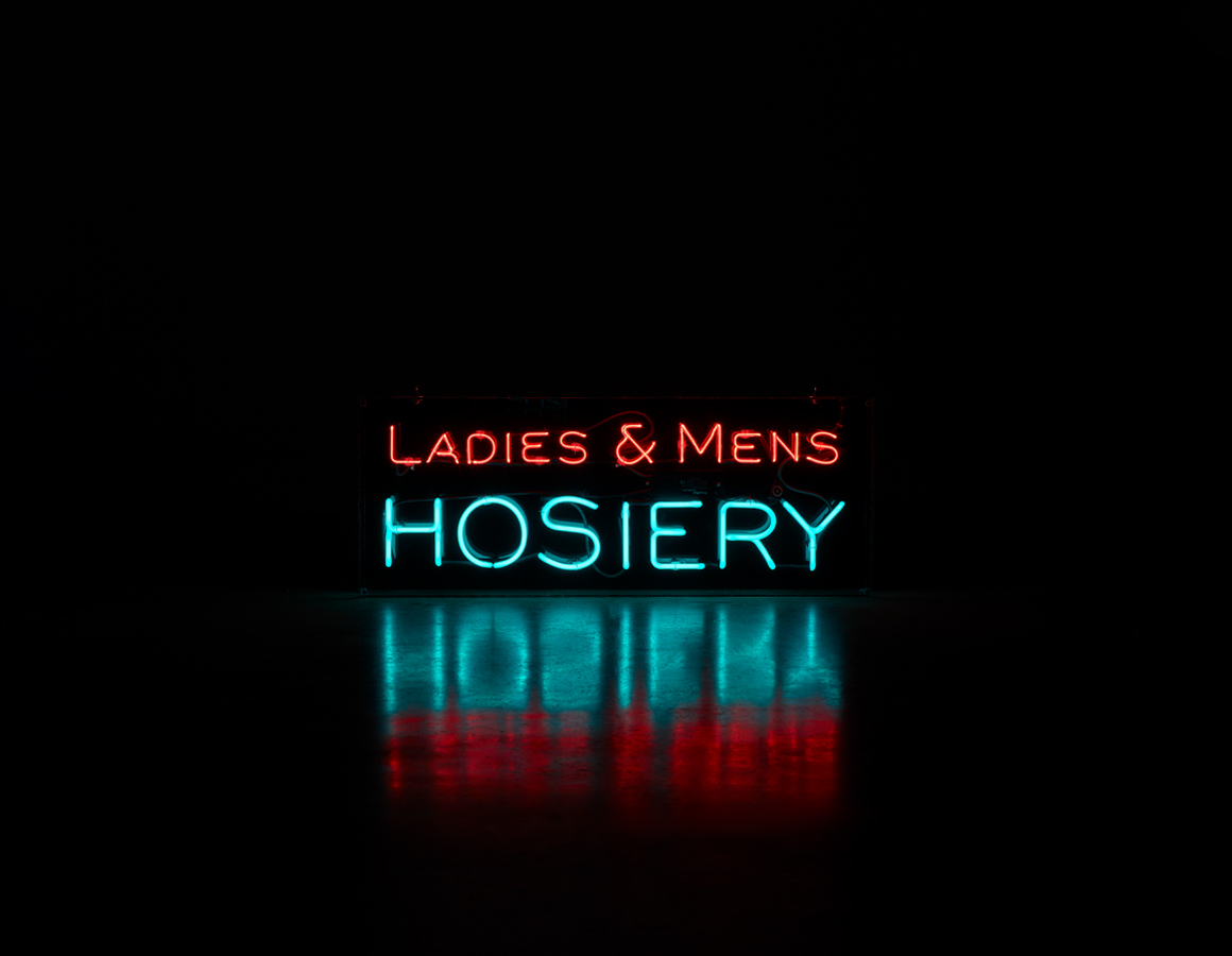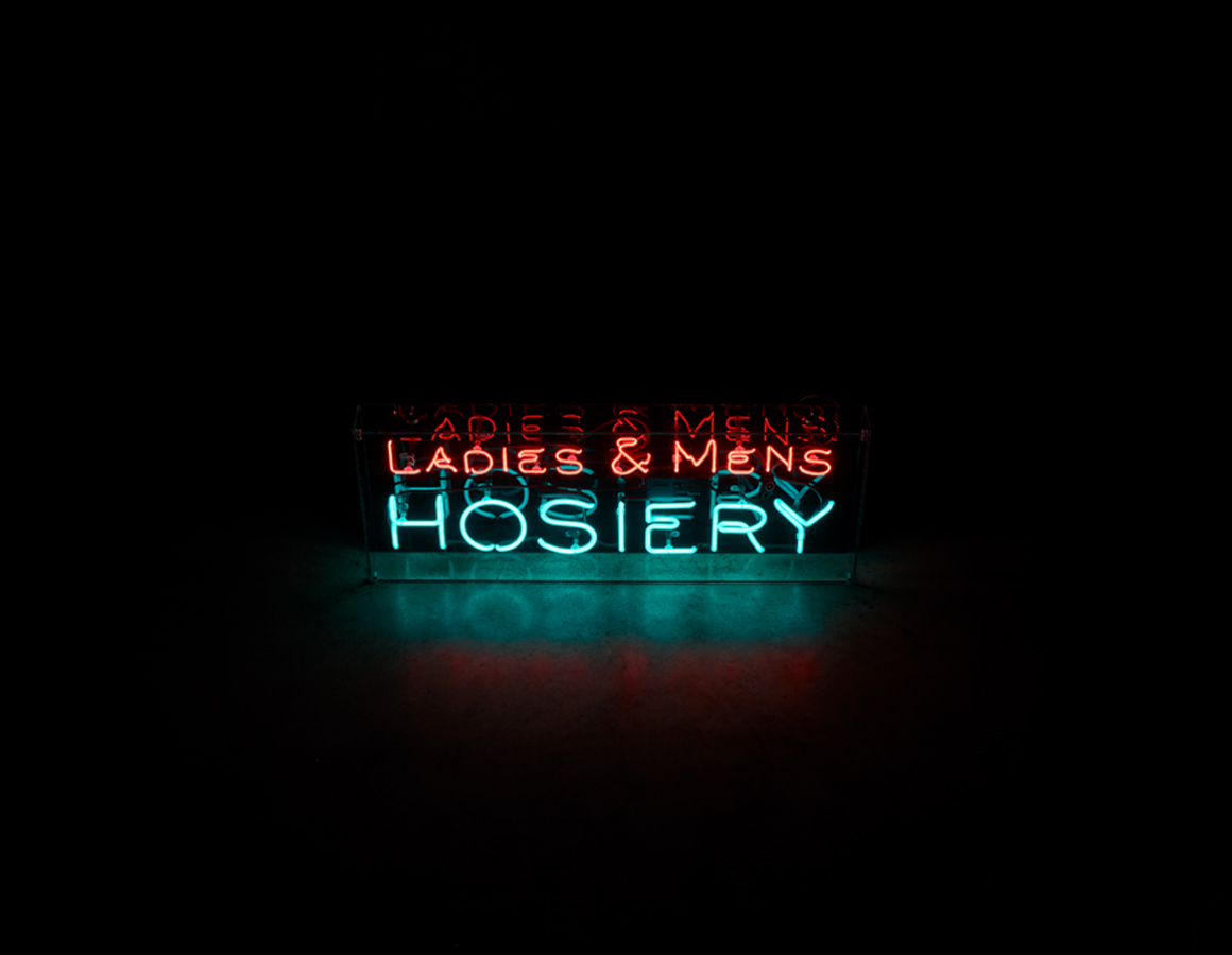 Ladies & Mens Hosiery clear red and turquoise neon mounted within an acrylic case