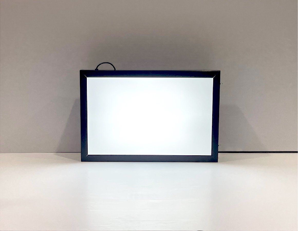 Black aluminium lightbox with opal panel and white LED illumination.