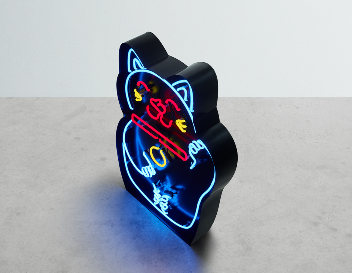 Lucky cat, blue, red & yellow neon mounted within a shaped black aluminium tray.