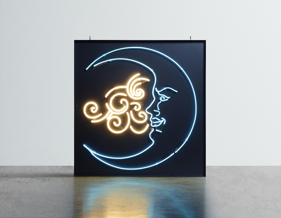 Exposed clear blue and warm white neon mounted within a black aluminium backing tray