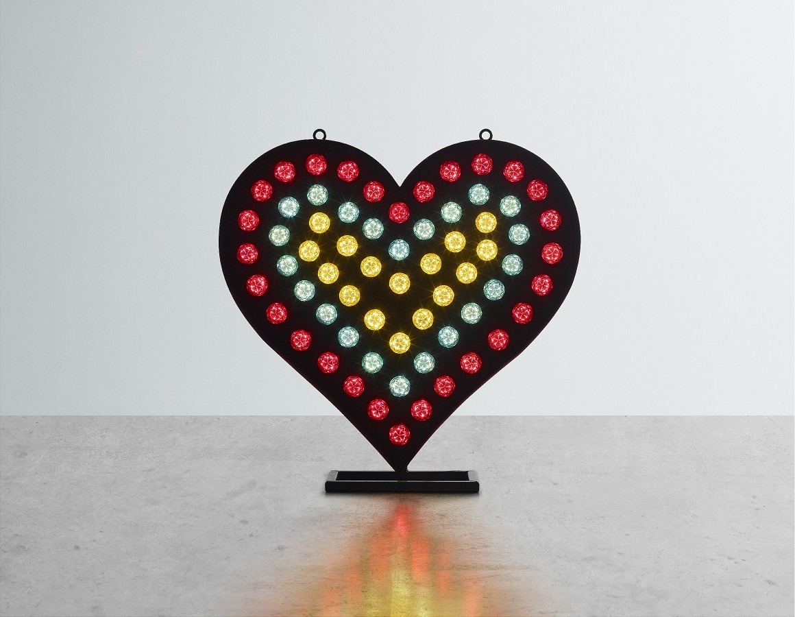 Red, turquoise and yellow cabochon bulbs mounted within a black aluminium heart shaped backing tray