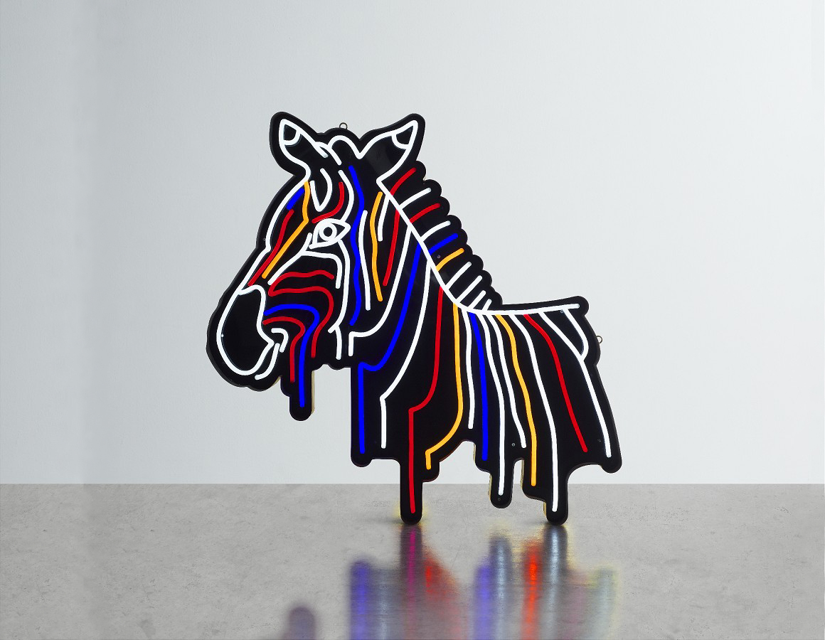 Exposed multicoloured LED neon flex mounted within an aged steel casing