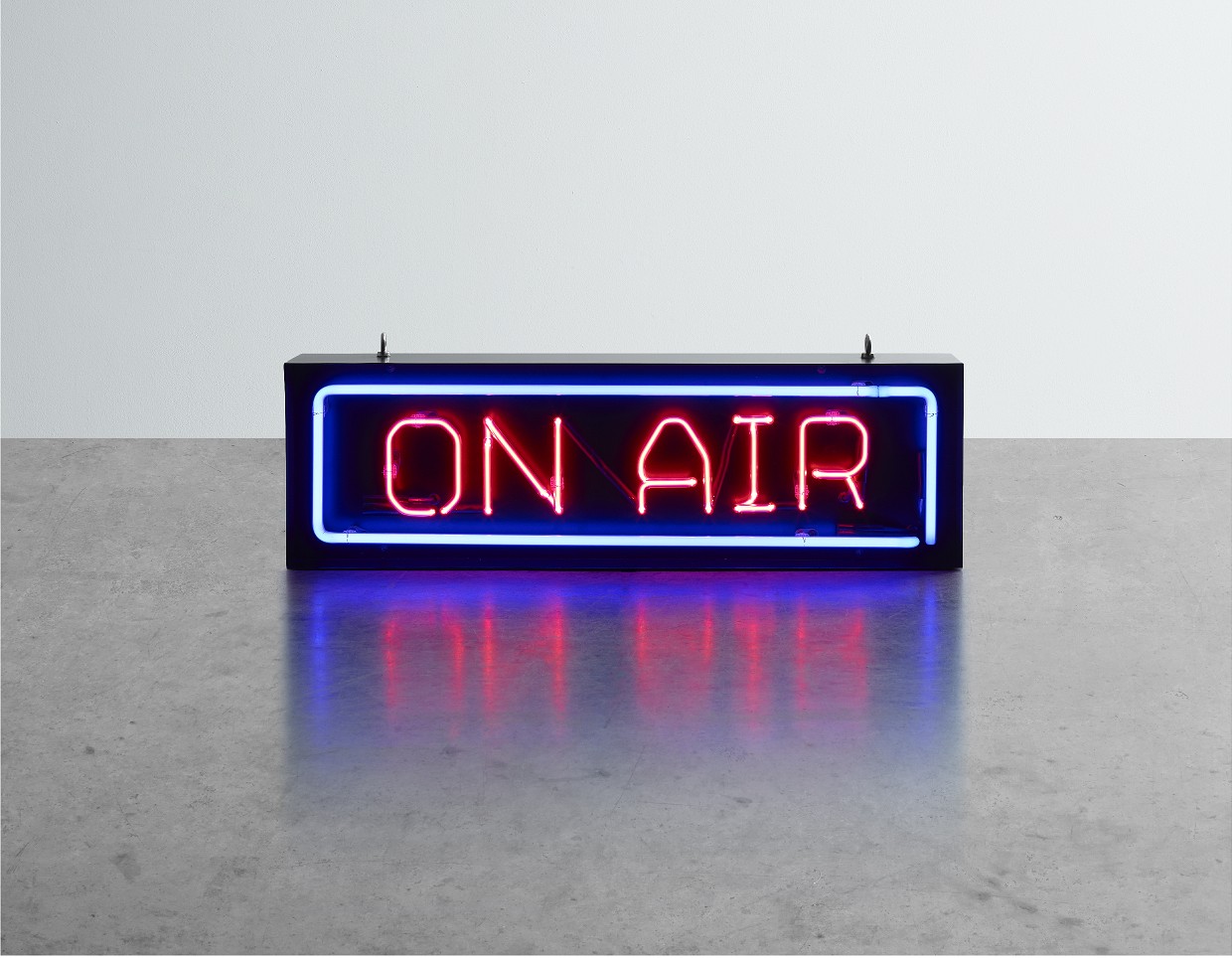 Exposed clear red & bromo blue neon mounted within a black aluminium backing tray