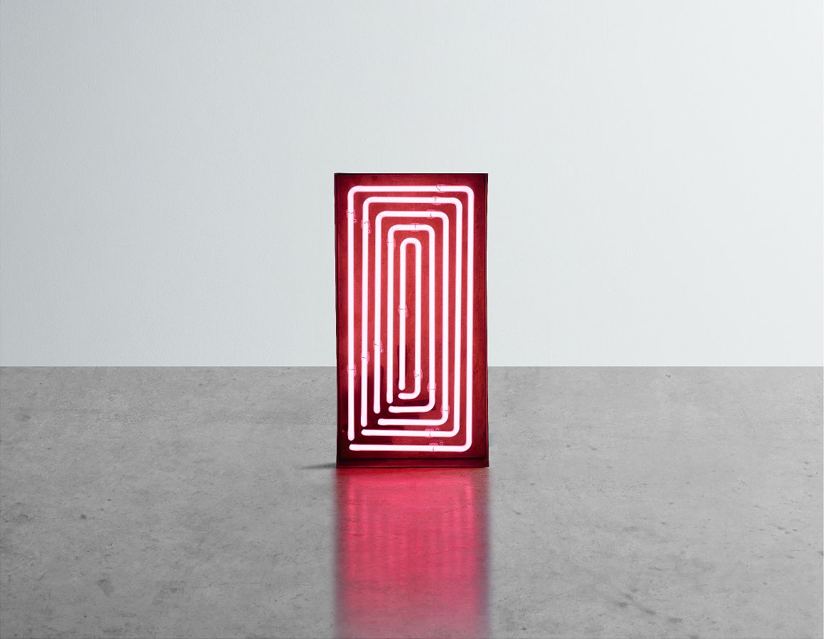 Exposed pink neon decreasing size rectangles mounted within an aged steel backing tray