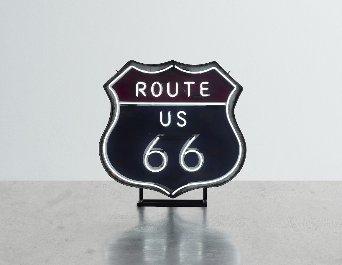 Route 66 neon road sign mounted within a shield shaped backing tray with detachable stand