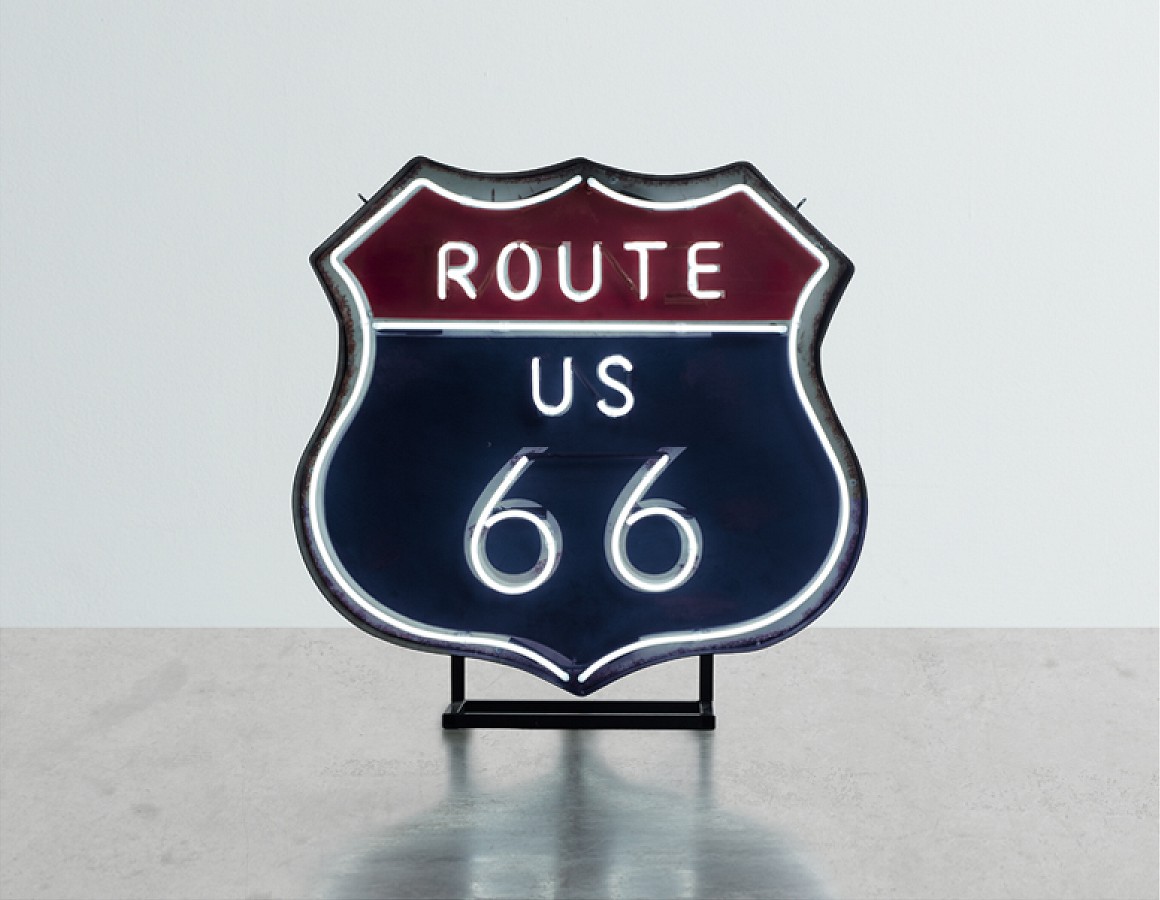 Route 66 neon road sign mounted within a shield shaped backing tray with detachable stand