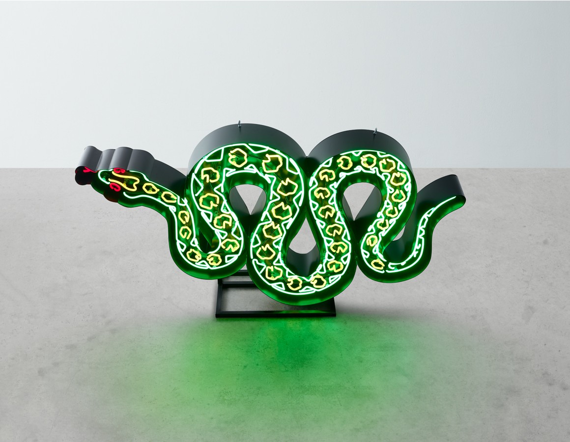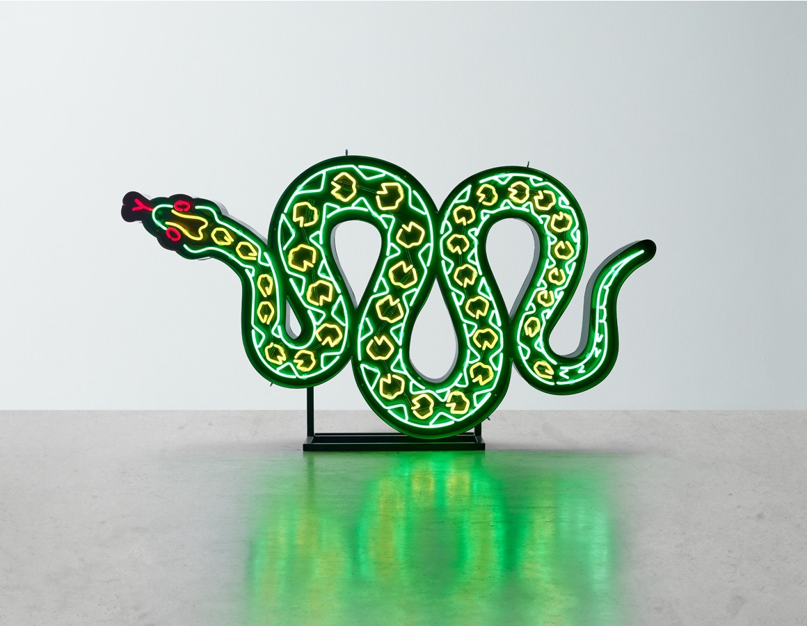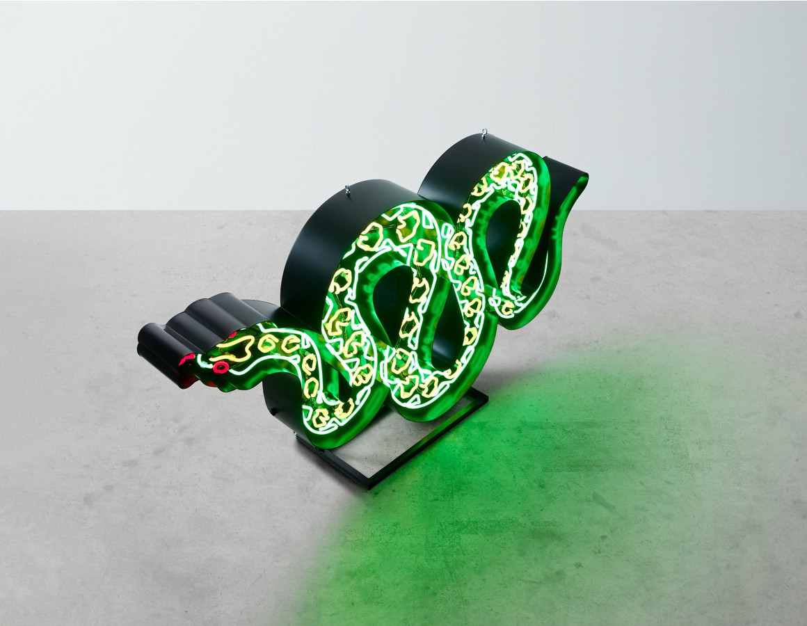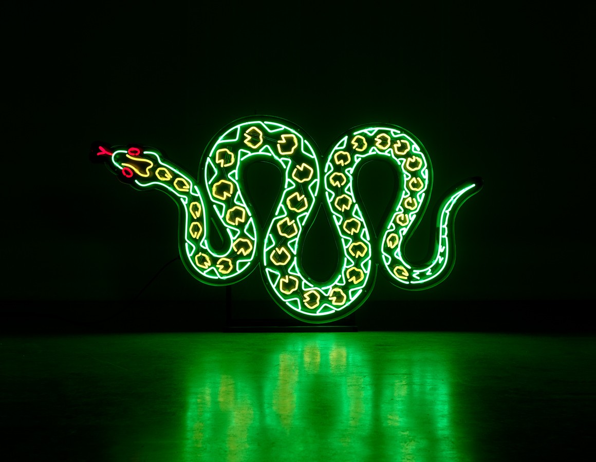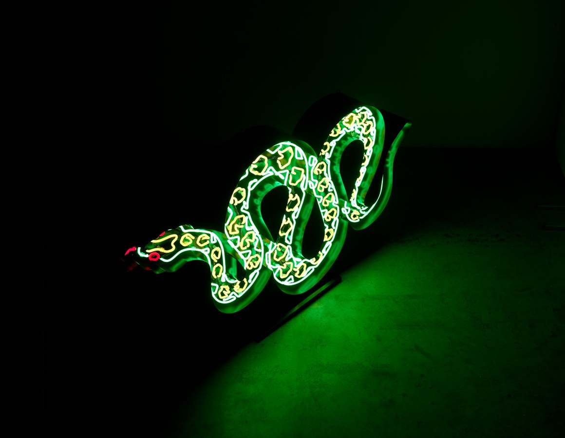snake neon mounted within a shaped backing tray with detachable stand