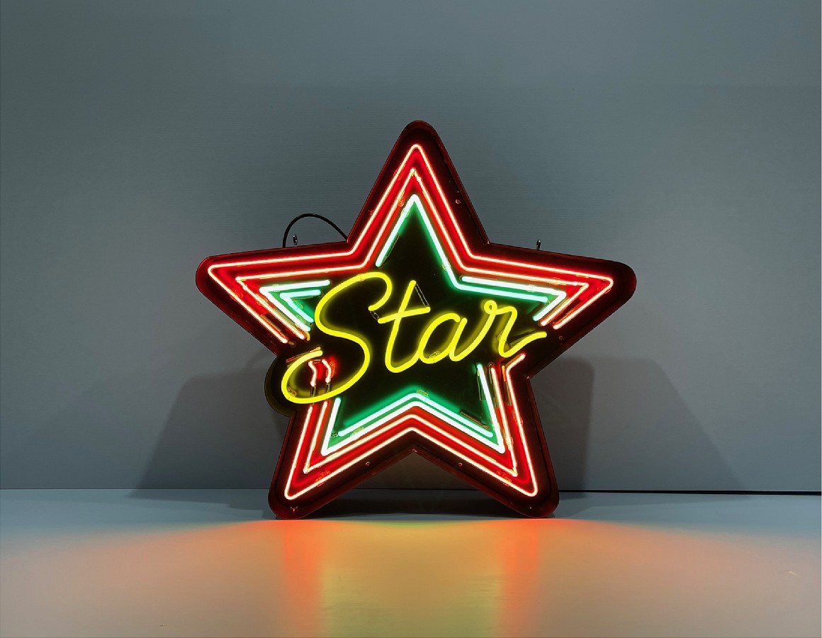 red and green multi-line neon star with yellow star lettering mounted within a shaped backing tray