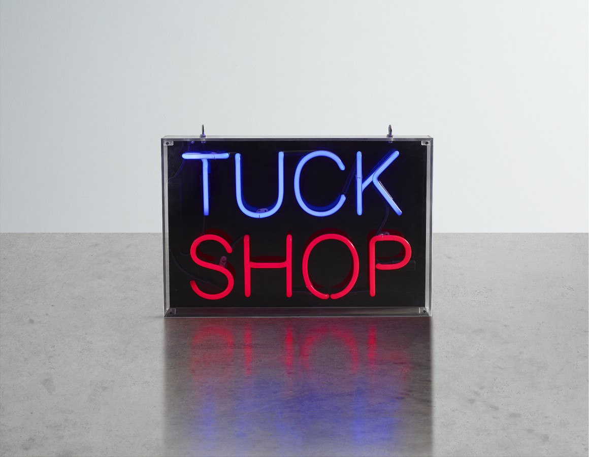 exposed ruby red and bromo blue neon mounted within an open fronted acrylic case