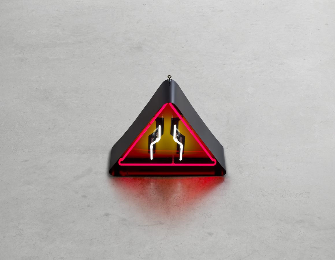Exposed neon road narrows neon sign mounted onto a vintage enamel sign within a black aluminium backing tray