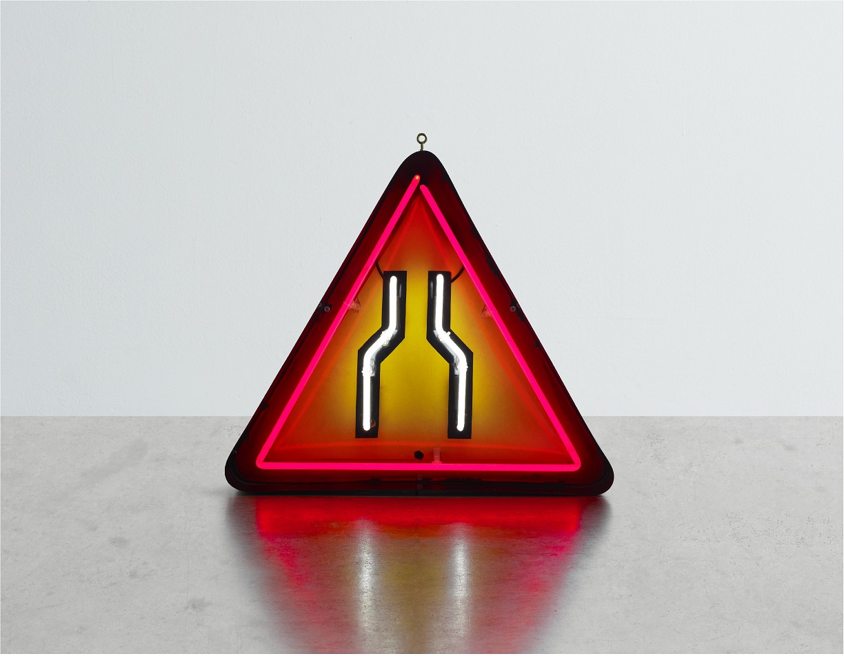 Exposed neon road narrows neon sign mounted onto a vintage enamel sign within a black aluminium backing tray