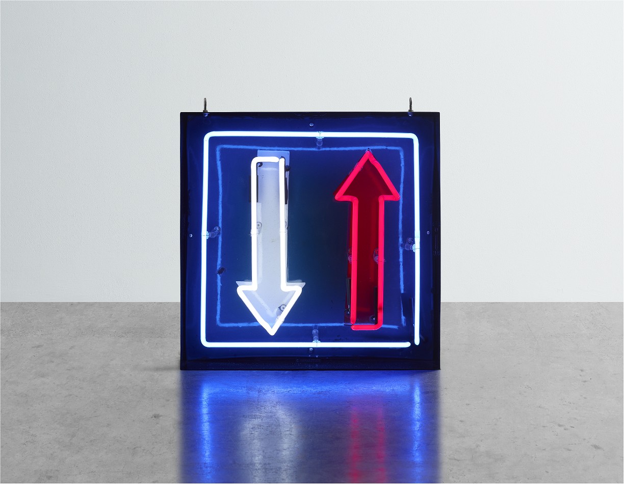 Exposed neon arrows and borderline mounted onto vintage enamel sign within an aged steel backing tray