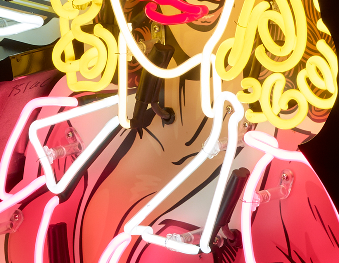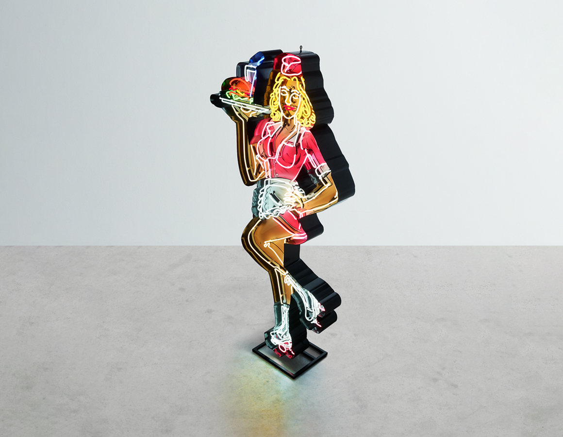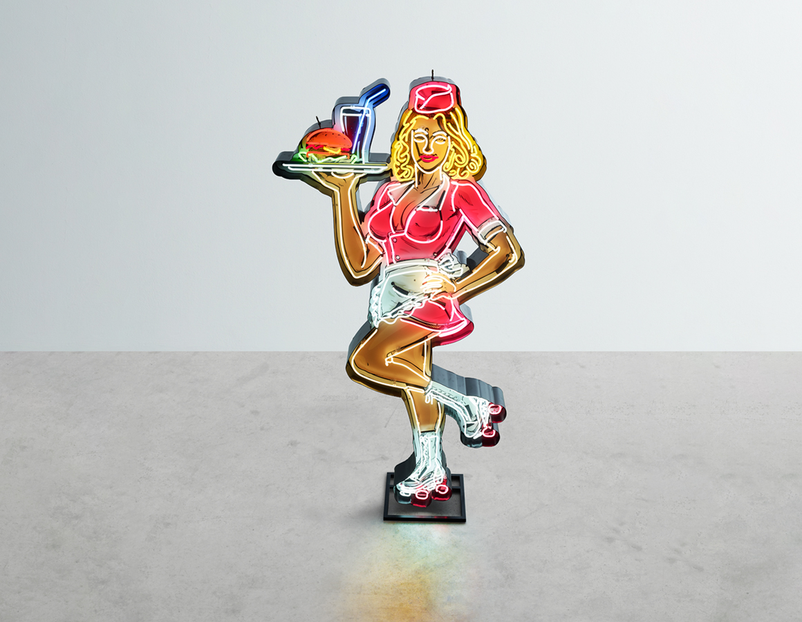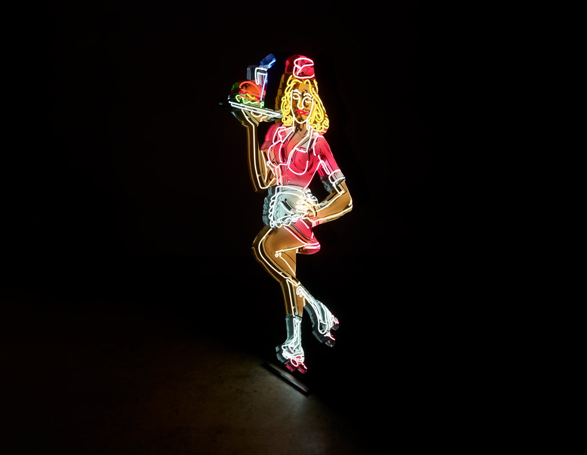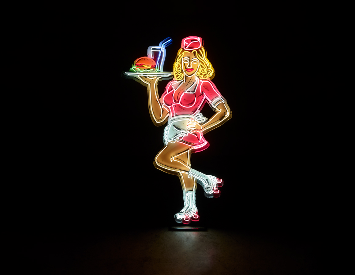 neon waitress on roller skates mounted within a shaped backing tray with stand