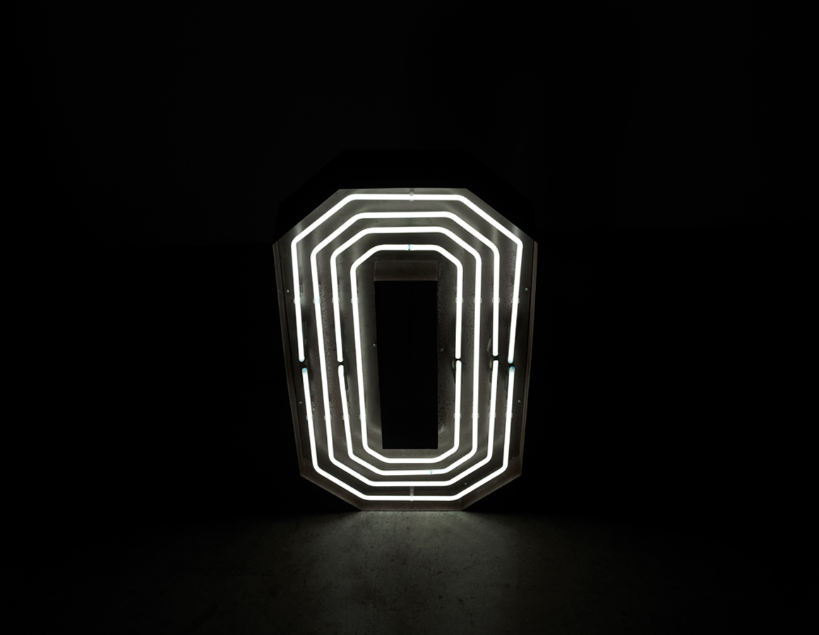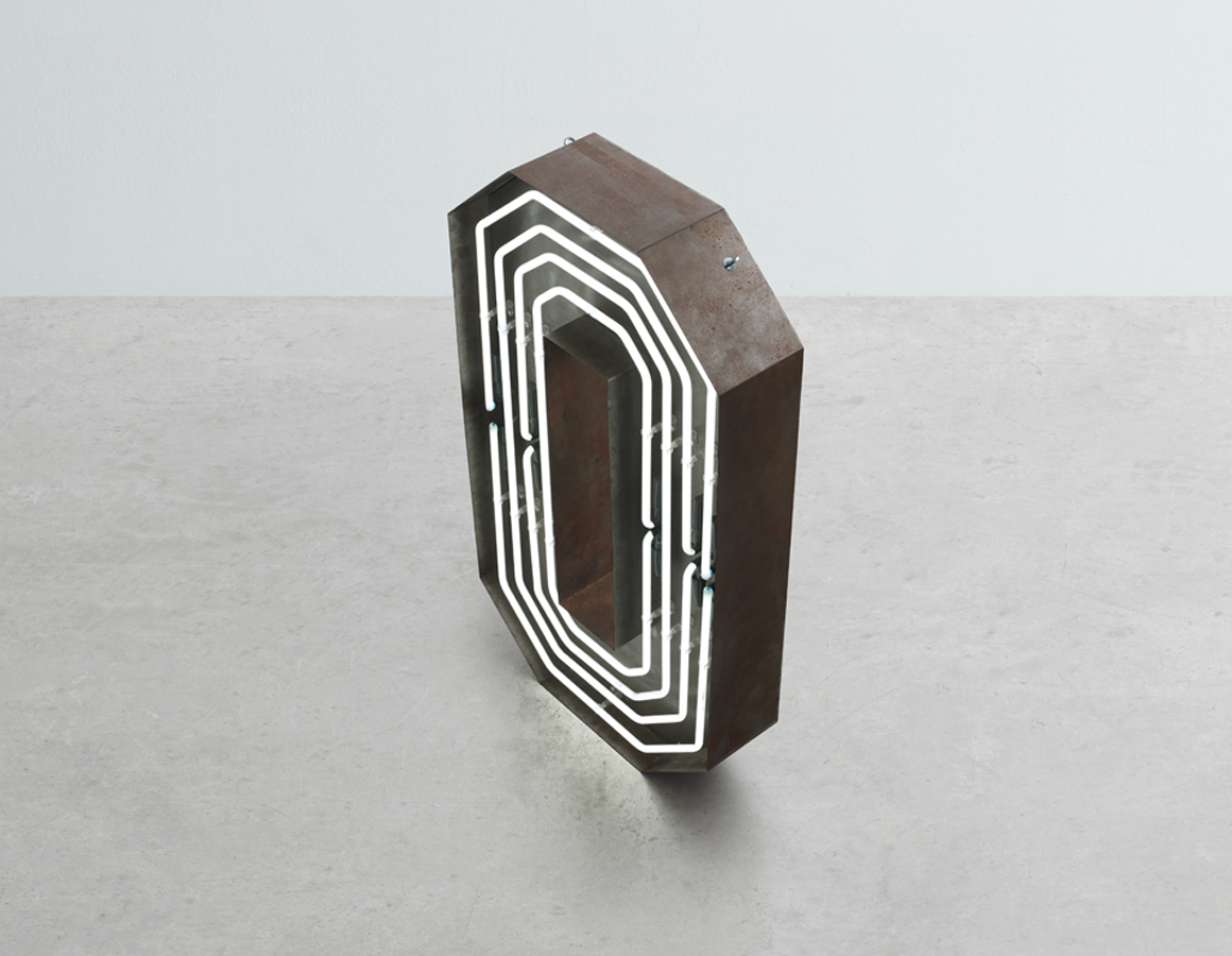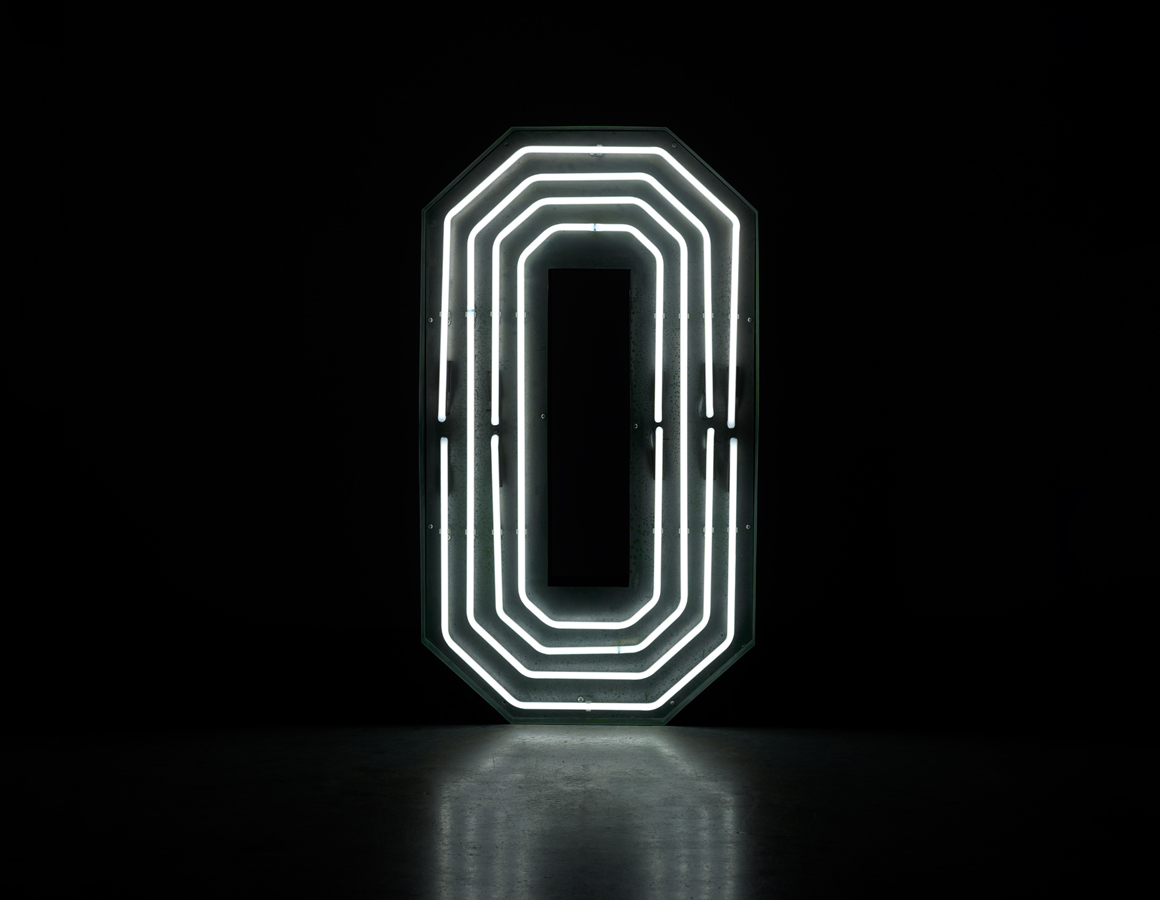 number ‘0’ multi line white neon mounted within an aged steel open front trough