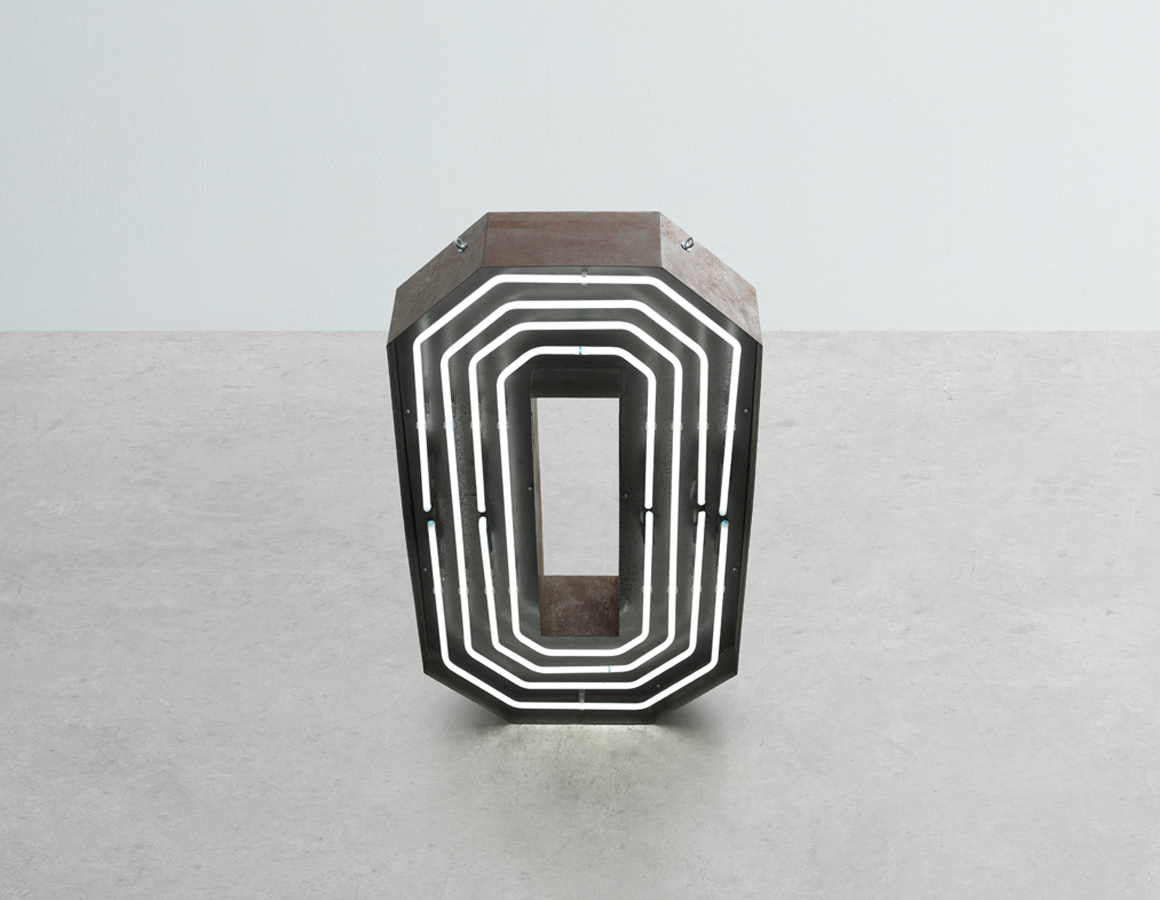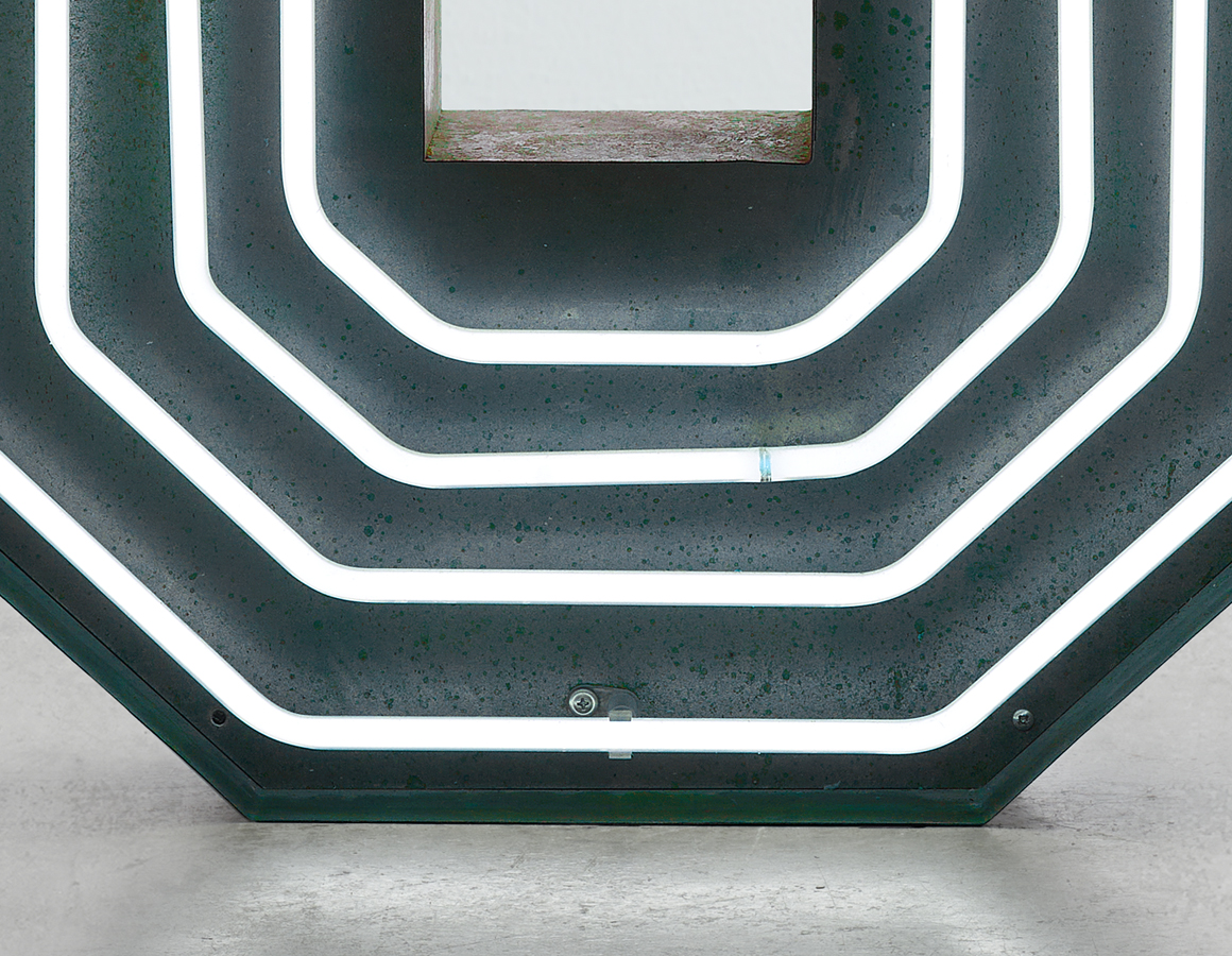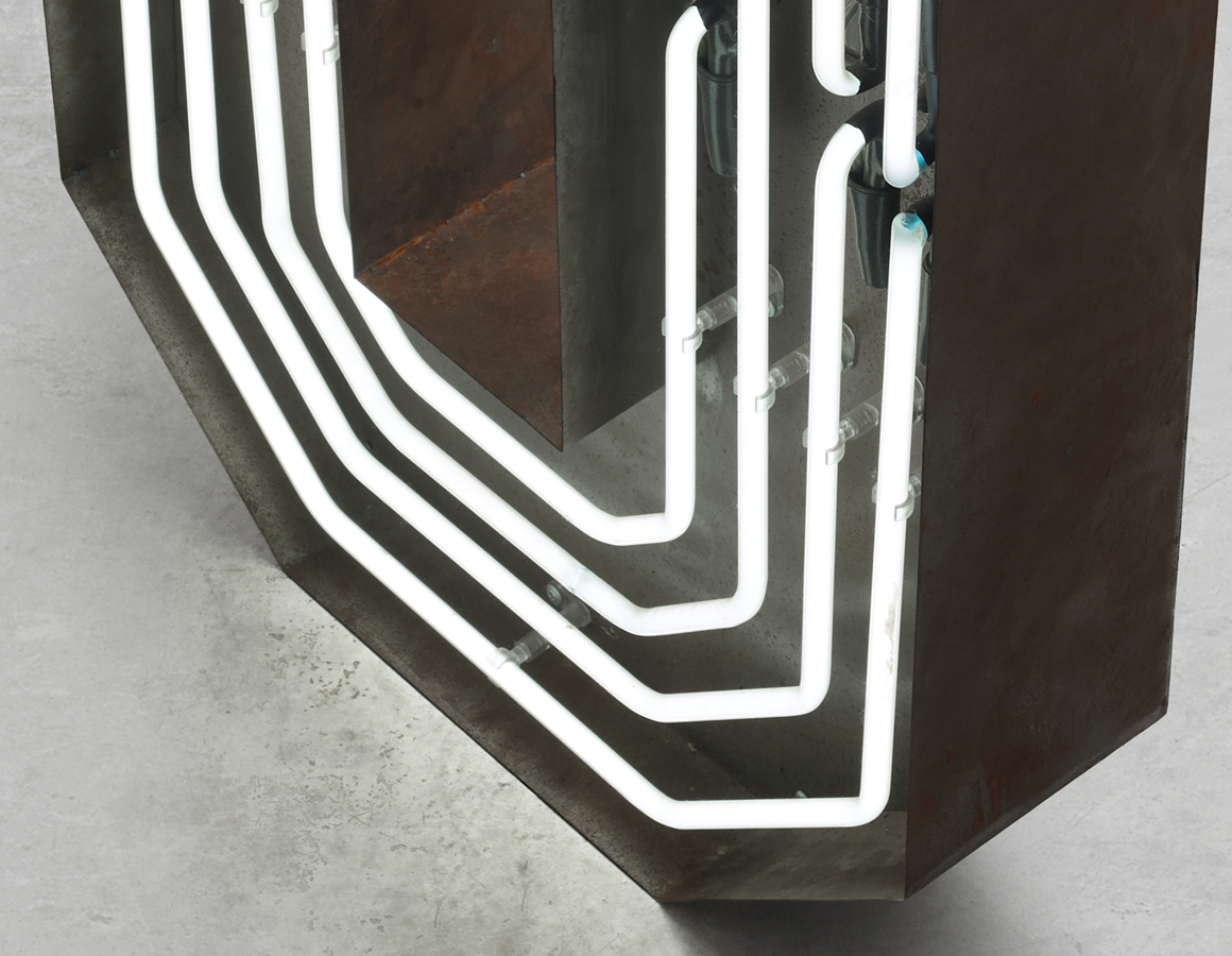 number ‘0’ multi line white neon mounted within an aged steel open front trough